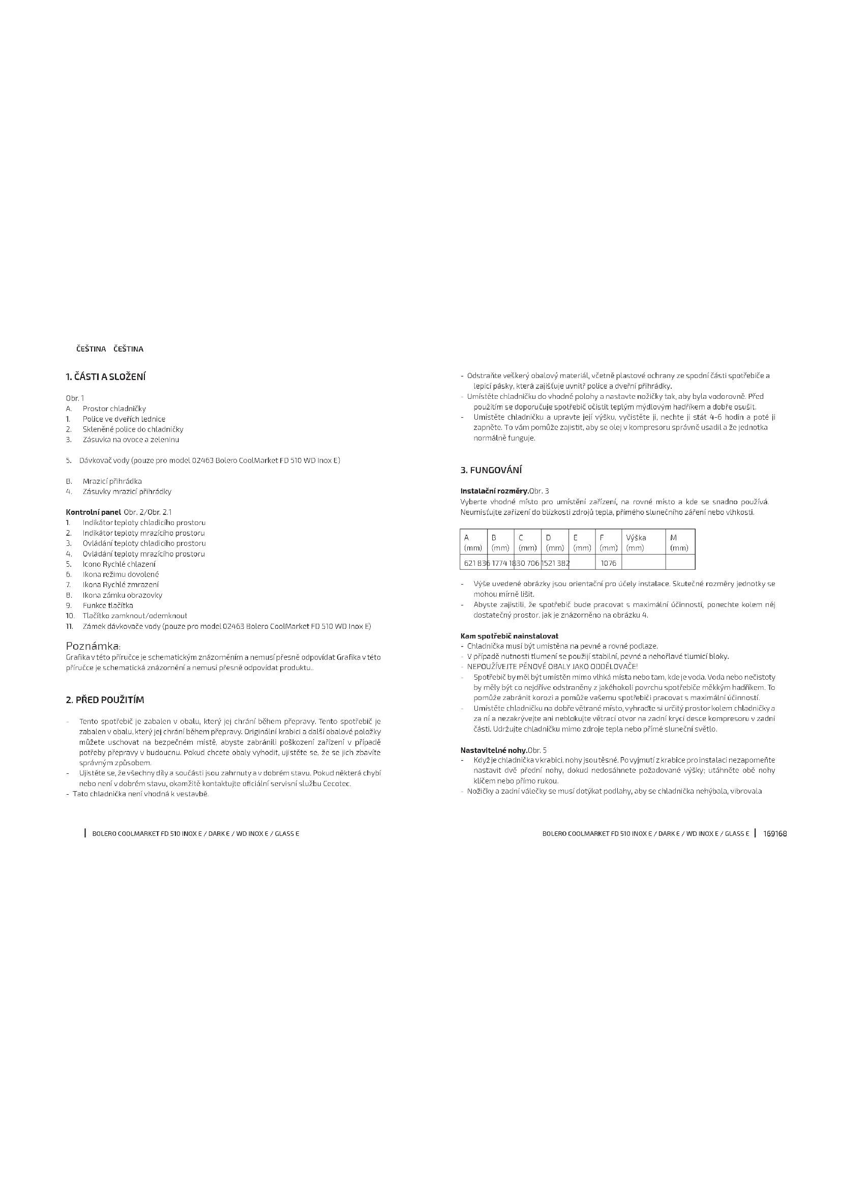 - Tento spotřebič je zabalen v obalu, který jej chrání během přepravy. Tento spotřebič je zabalen v obalu, který jej chrání během přepravy. Originální krabici a další obalové položky můžete uschovat na bezpečném místě, abyste zabránili poškození zařízení v případě potřeby přepravy v budoucnu. Pokud chcete obaly vyhodit, ujistěte se, že se jich zbavíte správným způsobem. - Ujistěte se, že všechny díly a součásti jsou zahrnuty a v dobrém stavu. Pokud některá chybí nebo není v dobrém stavu, okamžitě kontaktujte ociální servisní službu Cecotec. - Tato chladnička není vhodná k vestavbě.171170 BOLERO COOLMARKET FD 510 INOX E / DARK E / WD INOX E / GLASS E BOLERO COOLMARKET FD 510 INOX E / DARK E / WD INOX E / GLASS E