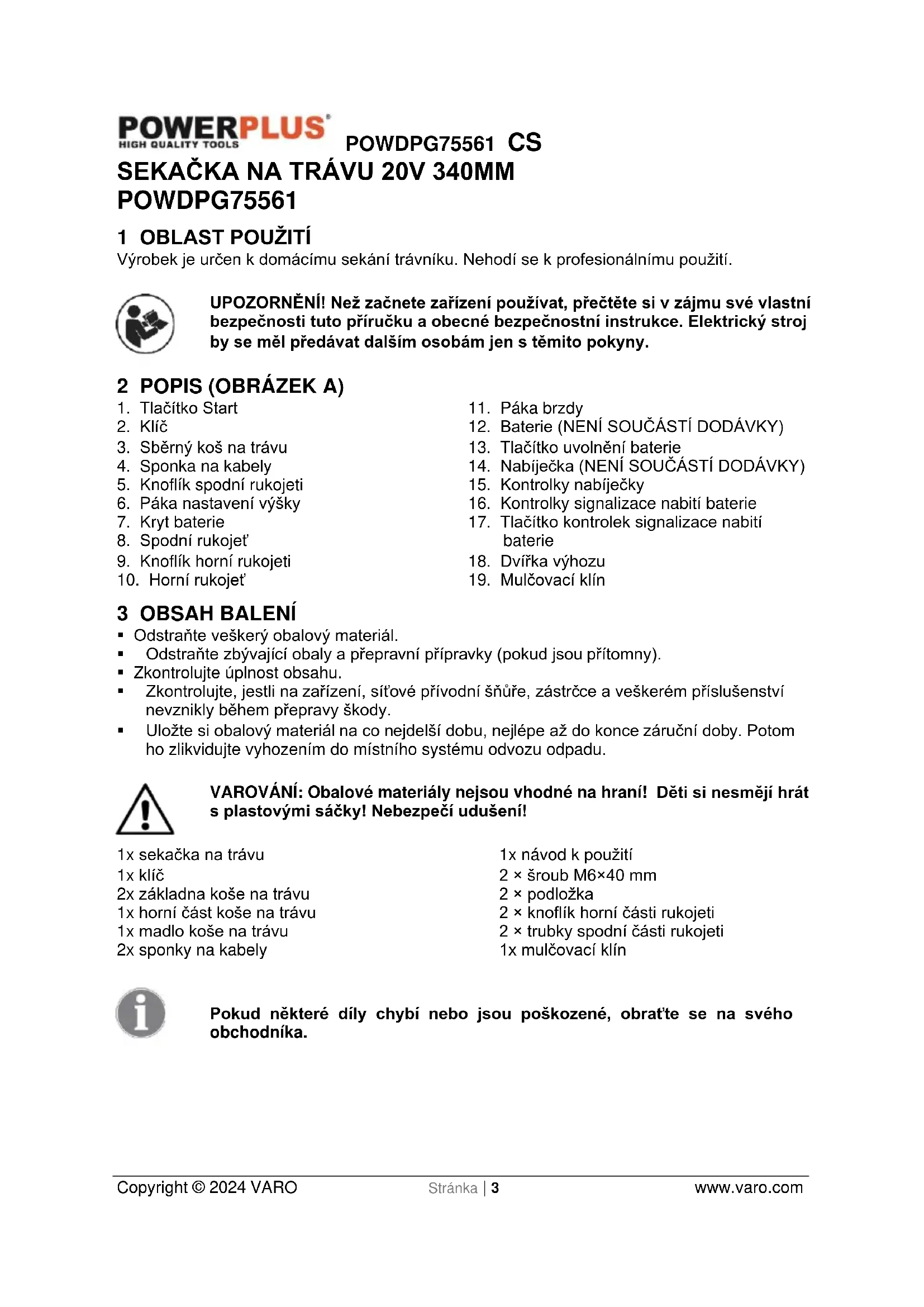 - Uložte si obalový materiál na co nejdelší dobu, nejlépe až do konce záruční doby. Potom ho zlikvidujte vyhozením do místního systému odvozu odpadu. VAROVÁNÍ: Obalové materiály nejsou vhodné na hraní! Děti si nesmějí hrát s plastovými sáčky! Nebezpečí udušení! 1x sekačka na trávu 1x klíč 2x základna koše na trávu 1x horní část koše na trávu 1x madlo koše na trávu 2x sponky na kabely 1x návod k použití 2 × šroub M6×40 mm 2 × podložka 2 × knoflík horní části rukojeti 2 × trubky spodní části rukojeti 1x mulčovací klín Pokud některé díly chybí nebo jsou poškozené, obraťte se na svého obchodníka.POWDPG75561 CS Copyright © 2024 VARO Stránka | 4 www.varo.com 4 SYMBOLY V tomto návodu nebo na stroji se používají následující symboly: