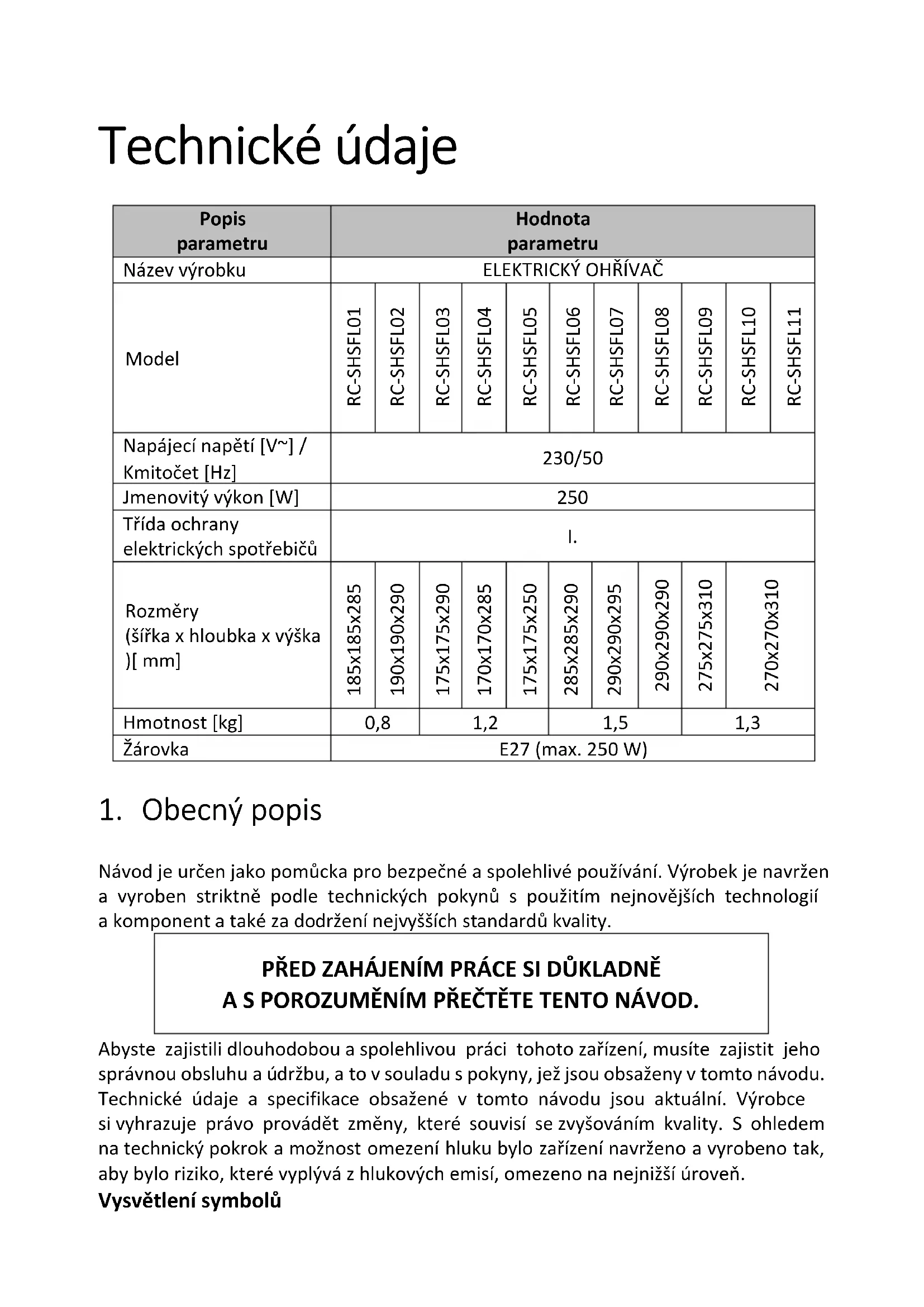 Problém Možná příčina Činnost Zařízení nefunguje. Zařízení není zapnuto. Zkontrolujte, zda je zařízení správně připojeno k elektrické instalaci, a zda je zapnuto. Poškození elektrického vodiče. Zadejte opravu elektrotechnikovi. Žárovka není správně zašroubovaná nebo je poškozená. Dotáhněte nebo vyměňte žárovku.Elektrická síť je bez napětí. Zkontrolujte jističe.Caractéristiques techniques Description paramètre Valeur paramètre Nom du produit CHAUFFAGE Modèle RC-SHSFL01 RC-SHSFL02 RC-SHSFL03 RC-SHSFL04 RC-SHSFL05 RC-SHSFL06 RC-SHSFL07 RC-SHSFL08 RC-SHSFL09 RC-SHSFL10 RC-SHSFL11 Tension d'alimentation [V~] / Fréquence [Hz] 230/50 Puissance nominale [W]