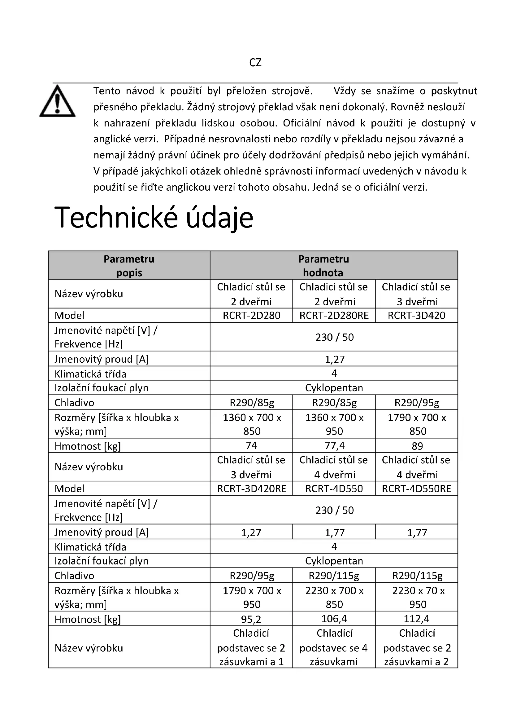Tento návod k použití byl přeložen strojově. Vždy se snažíme o poskytnutí přesného překladu. Žádný strojový překlad však není dokonalý. Rovněž neslouží k nahrazení překladu lidskou osobou. Oficiální návod k použití je dostupný v anglické verzi. Případné nesrovnalosti nebo rozdíly v překladu nejsou závazné a nemají žádný právní účinek pro účely dodržování předpisů nebo jejich vymáhání. V případě jakýchkoli otázek ohledně správnosti informací uvedených v návodu k použití se řiďte anglickou verzí tohoto obsahu. Jedná se o oficiální verzi. Technické údaje Parametru popis Parametru hodnota Název výrobku Chladicí stůl se 2 dveřmi Chladicí stůl se 2 dveřmi Chladicí stůl se 3 dveřmi Model RCRT-2D280