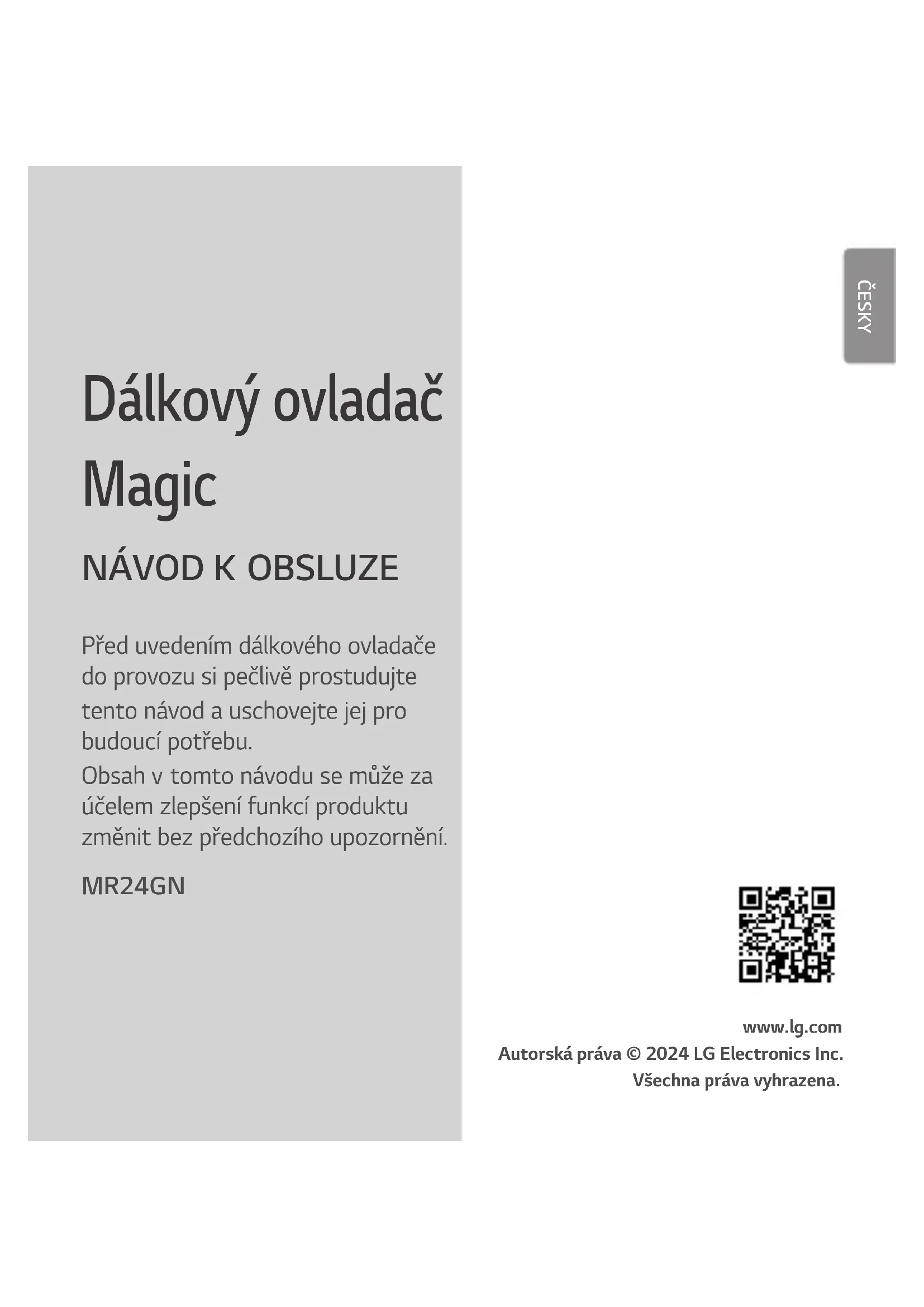 Před uvedením dálkového ovladače do provozu si pečlivě prostudujte tento návod a uschovejte jej pro budoucí potřebu. Obsah vtomto návodu se může za účelem zlepšení funkcí produktu změnit bez předchozího upozornění. MR24GN www.lg.com Autorská práva © 2024 LG Electronics Inc. Všechna práva vyhrazena. ČESKY2 Pokyny před zahájením instalace