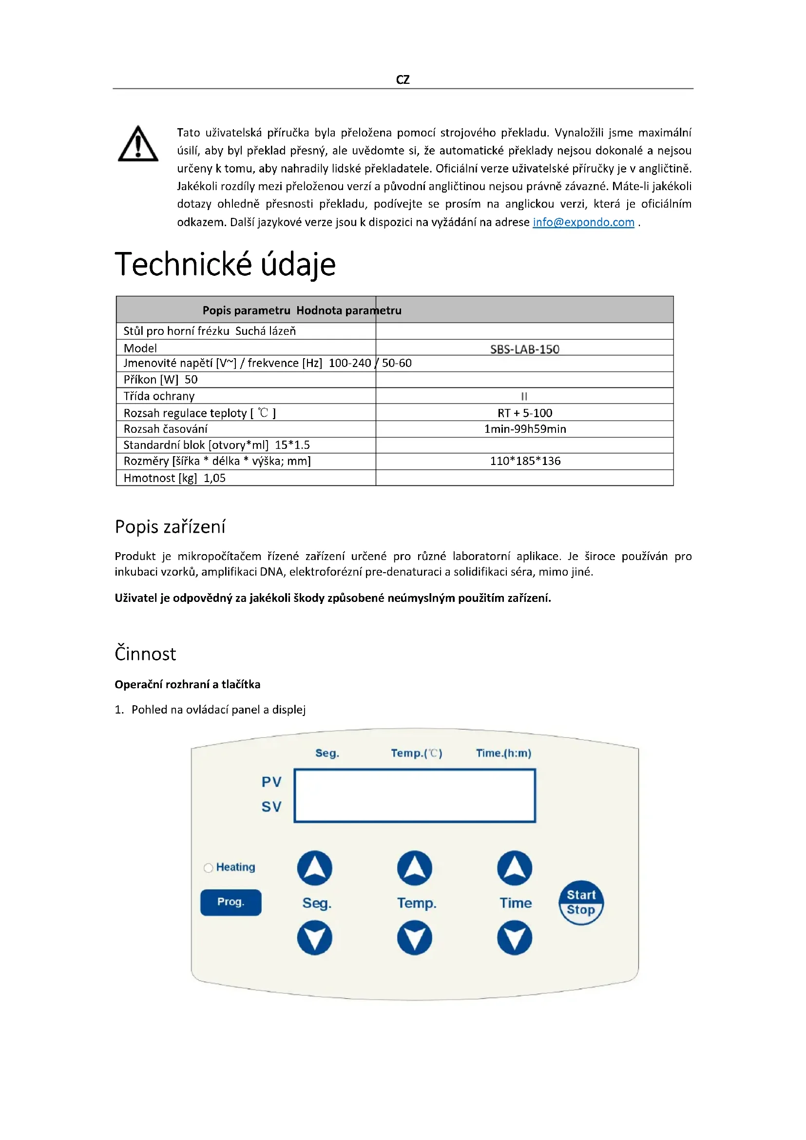 Tlačítko Návod Výběr programu: Vyberte požadovaný uzel programu s podporou až pěti uzlů: S1, S2, S3, S4 a S5. Nastavení teploty: Pomocí tlačítka nastavení teploty upravte provozní teplotu. Stiskněte " “ a „ ” pro změnu hodnoty teploty. Pro rychlejší nastavení dlouze stiskněte “ “ a „ ” pro změnu pozice číslice. Nastavení časování: Pomocí tlačítka nastavení časování nastavte dobu trvání. Stiskněte " “ a „ ” pro nastavení požadovaného času. Pro rychlejší nastavení dlouze stiskněte " “ a „ ” pro změnu pozice číslice. Nastavení programu: Stiskněte tlačítko tlačítko pro výběr koncového bodu. Výchozí uzel je S1. Lze konfigurovat následující programové sekvence: S1-S2, S1-S2-S3, S1-S2-S3-S4 a S1-S2-S3-S4-S5. Start/Stop: Stiskněte tlačítko tlačítko pro zahájení činnosti programu. Dalším stisknutím zastavíte program. Návod k obsluze