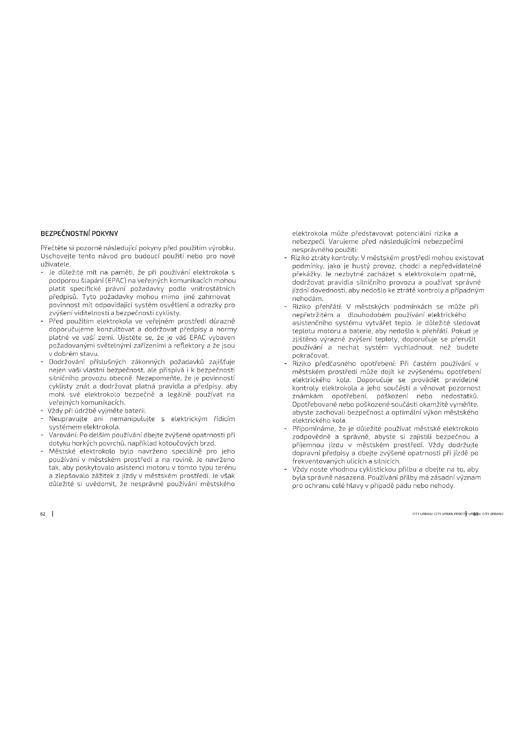 Přečtěte si pozorně následující pokyny před použitím výrobku. Uschovejte tento návod pro budoucí použití nebo pro nové uživatele. - Je důležité mít na paměti, že při používání elektrokola s podporou šlapání (EPAC) na veřejných komunikacích mohou platit specické právní požadavky podle vnitrostátních předpisů. Tyto požadavky mohou mimo jiné zahrnovat povinnost mít odpovídající systém osvětlení a odrazky pro zvýšení viditelnosti a bezpečnosti cyklisty. - Před použitím elektrokola ve veřejném prostředí důrazně doporučujeme konzultovat a dodržovat předpisy a normy platné ve vaší zemi. Ujistěte se, že je váš EPAC vybaven požadovanými světelnými zařízeními a reektory a že jsou v dobrém stavu. - Dodržování příslušných zákonných požadavků zajišťuje nejen vaši vlastní bezpečnost, ale přispívá i k bezpečnosti silničního provozu obecně. Nezapomeňte, že je povinností cyklisty znát a dodržovat platná pravidla a předpisy, aby mohl své elektrokolo bezpečně a legálně používat na veřejných komunikacích. - Vždy při údržbě vyjměte baterii. - Neupravujte ani nemanipulujte s elektrickým řídicím systémem elektrokola. - Varování: Po delším používání dbejte zvýšené opatrnosti při dotyku horkých povrchů, například kotoučových brzd. - Městské elektrokolo bylo navrženo speciálně pro jeho používání v městském prostředí a na rovině. Je navrženo tak, aby poskytovalo asistenci motoru v tomto typu terénu a zlepšovalo zážitek z jízdy v městském prostředí. Je však důležité si uvědomit, že nesprávné používání městského6564 CITY URBAN/ CITY URBAN PROCITY URBAN/ CITY URBAN PRO známky nadměrného opotřebení, prasklin nebo poškození. V případě zjištění jakýchkoli problémů je třeba je okamžitě řešit, aby se předešlo možným rizikům při jízdě. - VAROVÁNÍ: Stejně jako všechny mechanické součásti podléhá i systém EPAC opotřebení a vysokému zatížení. Různé materiály a součásti mohou reagovat na opotřebení nebo únavu ze zatížení různými způsoby. Pokud je životnost součásti překročena, může dojít k jejímu náhlému selhání, které může způsobit zranění cyklisty. Jakákoli forma prasklin, škrábanců nebo změny barvy ve vysoce namáhaných oblastech znamená, že životnost součásti byla dosažena a měla by být vyměněna. - VAROVÁNÍ: U složených součástí může být poškození nárazem pro uživatele neviditelné. Výrobce musí vysvětlit důsledky poškození nárazem a to, že v případě nárazu musí být kompozitní součásti vráceny výrobci ke kontrole nebo zlikvidovány a vyměněny. - Je důležité si uvědomit, že kompozitní součásti mohou být ovlivněny vysokými teplotami, zejména v uzavřeném prostředí. Doporučuje se nevystavovat elektrokolo intenzivním zdrojům tepla, jako jsou radiátory, výfuky vozidel nebo skladování v uzavřených prostorách bez dostatečného větrání. Nadměrné teplo může způsobit deformaci, oslabení materiálů nebo dokonce selhání konstrukce. - Při instalaci dětské sedačky na elektrokolo je nutné zajistit, aby bylo odpružení pod sedlem dostatečně zakryté. Je to z toho důvodu, aby se předešlo riziku, že se do odpružení zachytí prsty dítěte nebo jiné předměty, což může způsobit zranění. - Je důležité si uvědomit, že řídítka elektrokola mohou mít významný vliv na reakci cyklisty při zatáčení a brzdění. Nesprávně nastavená řídítka mohou způsobit problémy - Pravidelně kontrolujte správnou funkci brzd pro jeho správnou funkci. Zkontrolujte opotřebení brzdových destiček a v případě potřeby je seřiďte. Brzdy v dobrém stavu jsou nezbytné pro zajištění účinné brzdné schopnosti. - Pravidelně kontrolujte tlak v pneumatikách. Zkontrolujte, zda jsou pneumatiky nahuštěny na doporučený tlak. Nedostatečně nahuštěné pneumatiky mohou ovlivnit stabilitu a výkonnost elektrokola a zvyšují riziko defektu. - Zkontrolujte řízení elektrokola a ujistěte se, že je správně seřízeno. Prověřte, zda mu nechybí volnost, a ujistěte se, že se otáčí hladce a bez překážek. Volné nebo poškozené řízení může ohrozit ovládání elektrokola. - Pravidelně kontrolujte ráfky pneumatiky, zda nejsou poškozené nebo deformované. Ujistěte se, že jsou v dobrém stavu, bez prasklin, promáčklin nebo jiných problémů, které by mohly ohrozit jejich strukturu. - Dávejte pozor při brzdění na mokré vozovce. Nezapomeňte, že na mokrém povrchu mohou být brzdy méně účinné, proto za mokra nebo na kluzkém povrchu prodlužte brzdnou dráhu a snižte rychlost. - Je nezbytné používat originální náhradní díly pro komponenty důležité z hlediska bezpečnosti. Tyto díly jsou speciálně navrženy pro vaše elektrokolo, splňují příslušné normy a zaručují optimální výkon a bezpečnost. Použití neoriginálních dílů může ohrozit bezpečnost a funkci kola. Upřednostněte svou bezpečnost a používejte pouze originální náhradní díly dodané výrobcem nebo autorizovaným prodejcem. - Je důležité dávat pozor na ráfky kol a dávat pozor na nebezpečné opotřebení. - Ráfky kol mohou podléhat opotřebení vlivem různých faktorů, jako jsou nárazy, tření nebo dlouhodobé používání. Je nezbytné pravidelně kontrolovat ráfky kol, zda nevykazují6766 CITY URBAN/ CITY URBAN PROCITY URBAN/ CITY URBAN PRO výkonu tohoto elektrokola nepoužívejte na tomto modelu nosiče na kola a dětské sedačky. Instalace nosičů na kola nebo dětských sedaček by mohla ovlivnit rovnováhu, stabilitu a bezpečný provoz elektrokola. - Dbejte na to, abyste baterii elektrokola nabíjeli pouze v interiéru, na suchém a chráněném místě. Zabraňte vystavování nabíječky a baterie nepřízniv