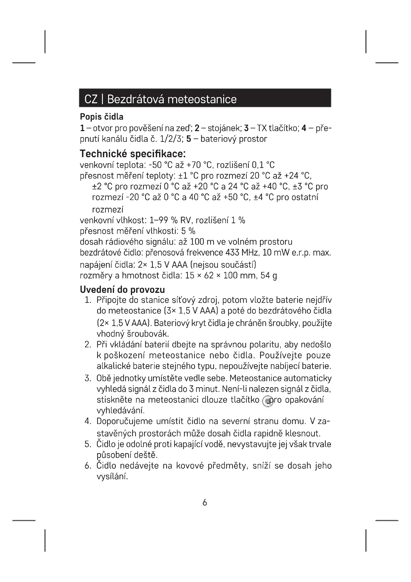 kpoškození meteostanice nebo čidla. Používejte pouze alkalické baterie stejného typu, nepoužívejte nabíjecí baterie.