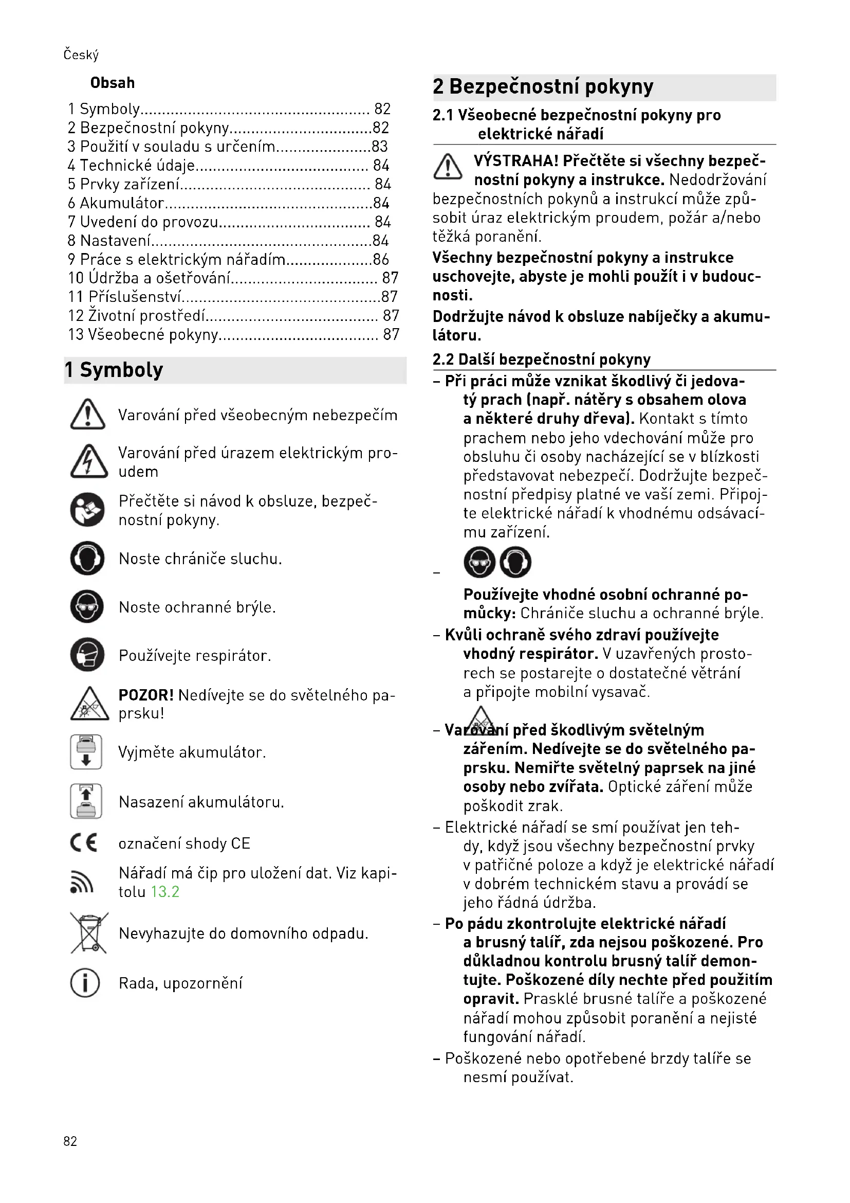 - 13 Všeobecné pokyny 1 Symboly Varování před všeobecným nebezpečím Varování před úrazem elektrickým pro udem Přečtěte si návod kobsluze, bezpeč nostní pokyny. Noste chrániče sluchu. Noste ochranné brýle. Používejte respirátor. POZOR! Nedívejte se do světelného pa prsku! Vyjměte akumulátor. Nasazení akumulátoru. označení shody CE Nářadí má čip pro uložení dat. Viz kapi tolu13.2 Nevyhazujte do domovního odpadu. Rada, upozornění 2 Bezpečnostní pokyny p. 87