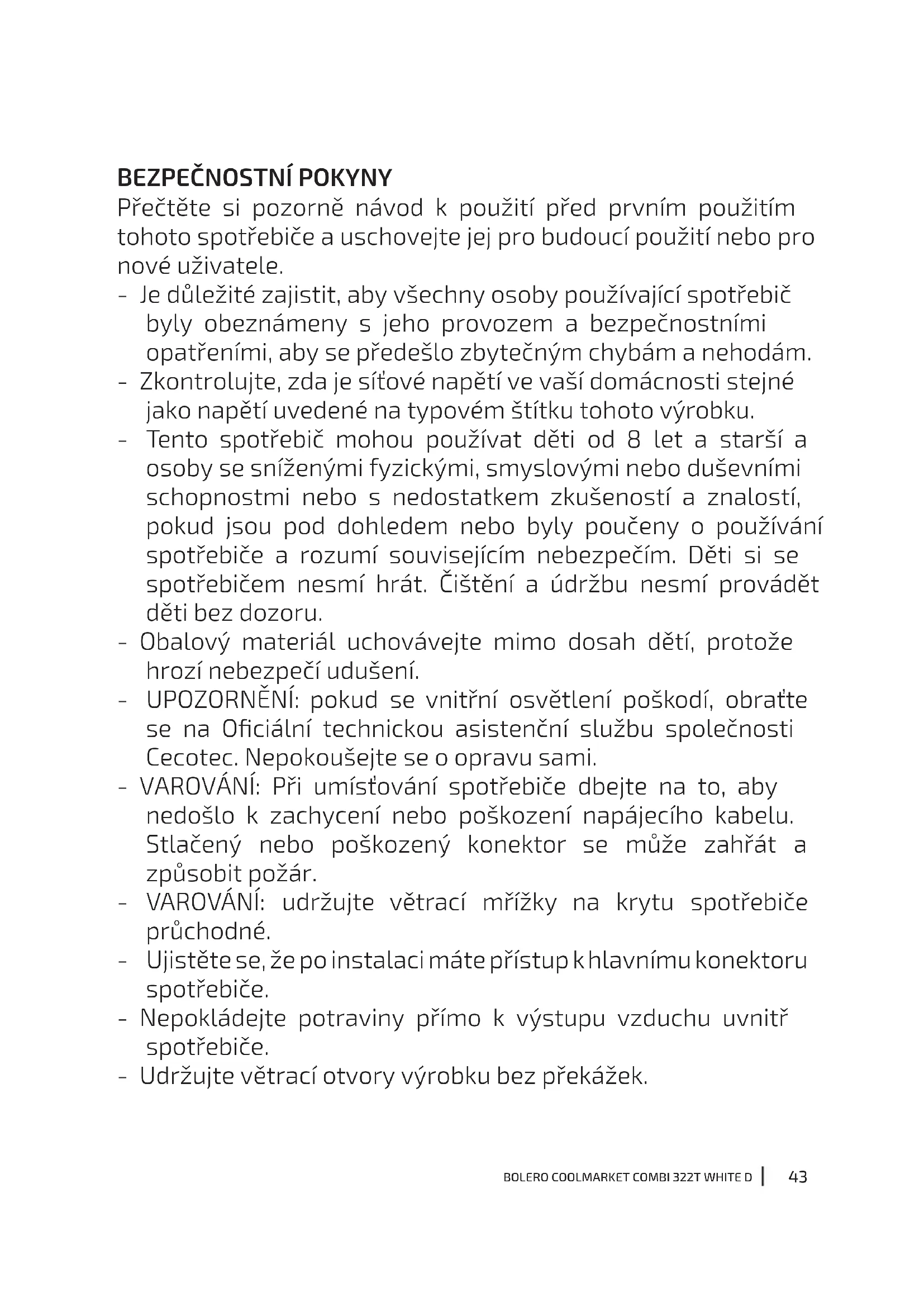 Přečtěte si pozorně návod k použití před prvním použitím tohoto spotřebiče a uschovejte jej pro budoucí použití nebo pro nové uživatele. - Je důležité zajistit, aby všechny osoby používající spotřebič byly obeznámeny s jeho provozem a bezpečnostními opatřeními, aby se předešlo zbytečným chybám a nehodám. - Zkontrolujte, zda je síťové napětí ve vaší domácnosti stejné jako napětí uvedené na typovém štítku tohoto výrobku. - Tento spotřebič mohou používat děti od 8 let a starší a osoby se sníženými fyzickými, smyslovými nebo duševními schopnostmi nebo s nedostatkem zkušeností a znalostí, pokud jsou pod dohledem nebo byly poučeny o používání spotřebiče a rozumí souvisejícím nebezpečím. Děti si se spotřebičem nesmí hrát. Čištění a údržbu nesmí provádět děti bez dozoru. - Obalový materiál uchovávejte mimo dosah dětí, protože hrozí nebezpečí udušení. - UPOZORNĚNÍ: pokud se vnitřní osvětlení poškodí, obraťte se na Ociální technickou asistenční službu společnosti Cecotec. Nepokoušejte se o opravu sami. - VAROVÁNÍ: Při umísťování spotřebiče dbejte na to, aby nedošlo k zachycení nebo poškození napájecího kabelu. Stlačený nebo poškozený konektor se může zahřát a způsobit požár. - VAROVÁNÍ: udržujte větrací mřížky na krytu spotřebiče průchodné. - Ujistěte se, že po instalaci máte přístup k hlavnímu konektoru spotřebiče. - Nepokládejte potraviny přímo k výstupu vzduchu uvnitř spotřebiče. - Udržujte větrací otvory výrobku bez překážek.44