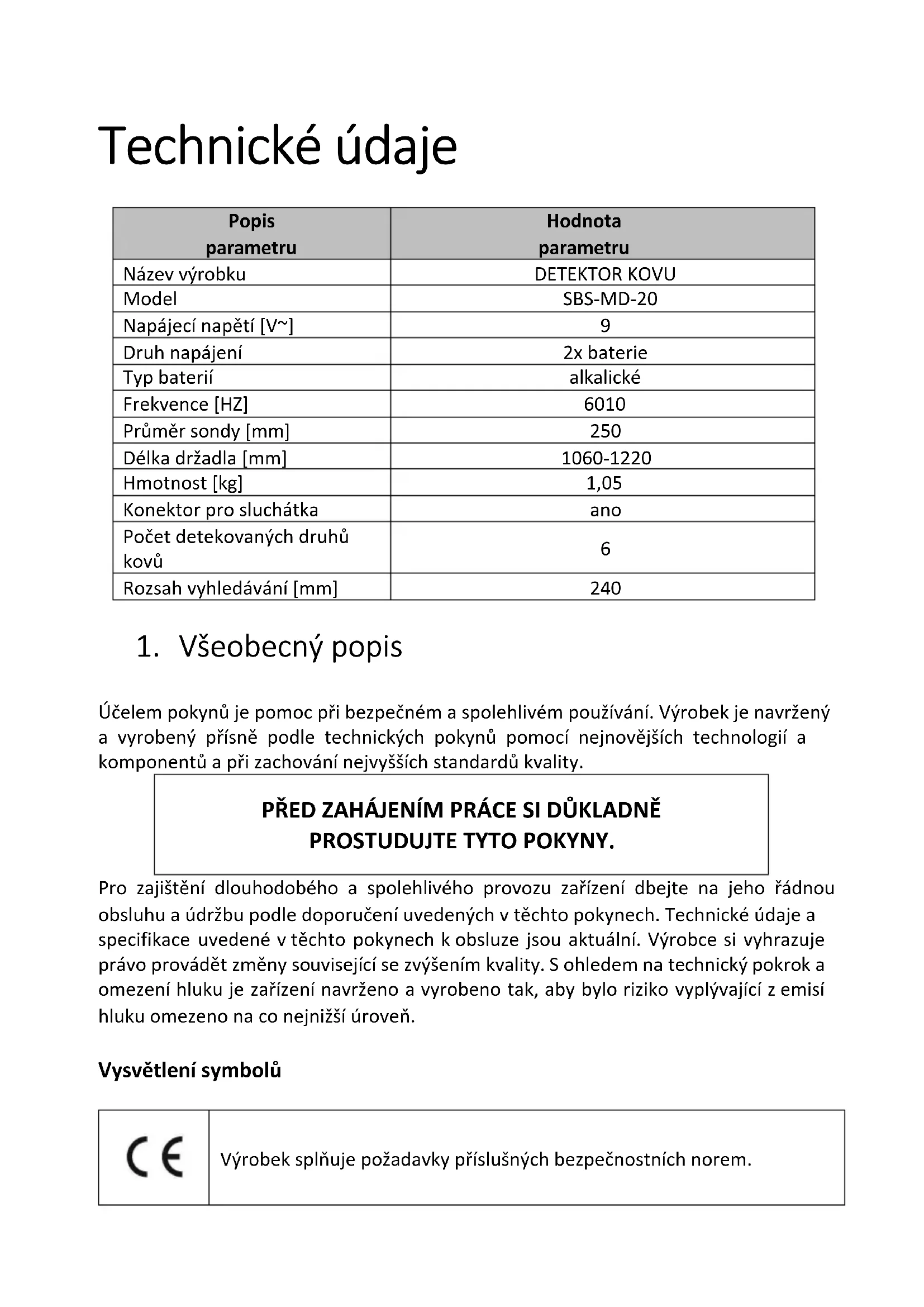 Výrazy „zařízení“ nebo „výrobek“ použité u varování a v pokynech se týkají <DETEKTORU KOVU>. 2.1. Bezpečnost na pracovišti a) V případě pochybností, zda výrobek funguje správně, nebo při zjištění jeho poškození kontaktujte servis výrobce. b) Opravy zařízení smí provádět výhradně servis výrobce. Výrobek nikdy neopravujte sami! c) Veškeré obalové materiály (plastové sáčky, karton, polystyren atd.) uchovávejte mimo dosah dětí, protože jsou potenciálním zdrojem nebezpečí a musí být zlikvidovány v souladu s platnými předpisy v místě, kde se zařízení používá.2.2. Bezpečné používání zařízení a) Opravu a údržbu zařízení musí provádět kvalifikovaní pracovníci pomocí výhradně originálních náhradních dílů. Bude tak zajištěno bezpečné používání. b) Aby byla zajištěna provozní integrita jednotky tak, jak byla navržena, neodstraňujte kryty instalované výrobcem ani šrouby. c) Pokyny k používání si uložte pro pozdější použití. Pokud má být zařízení předáno třetím osobám, předejte současně s ním rovněž pokyny k používání. d) Zařízení není hračka. Zabraňte dětem, aby si se zařízením hrály. e) Je zakázáno zasahovat do konstrukce zařízení a provádět změny jeho parametrů nebo konstrukce. f) Zařízení nepoužívejte ani neukládejte v blízkosti zdrojů ohně a tepla. g) Baterie, které nejsou vhodné k nabíjení, by neměly být dobíjeny. h) Nemíchejte různé typy baterií ani staré baterie s novými.