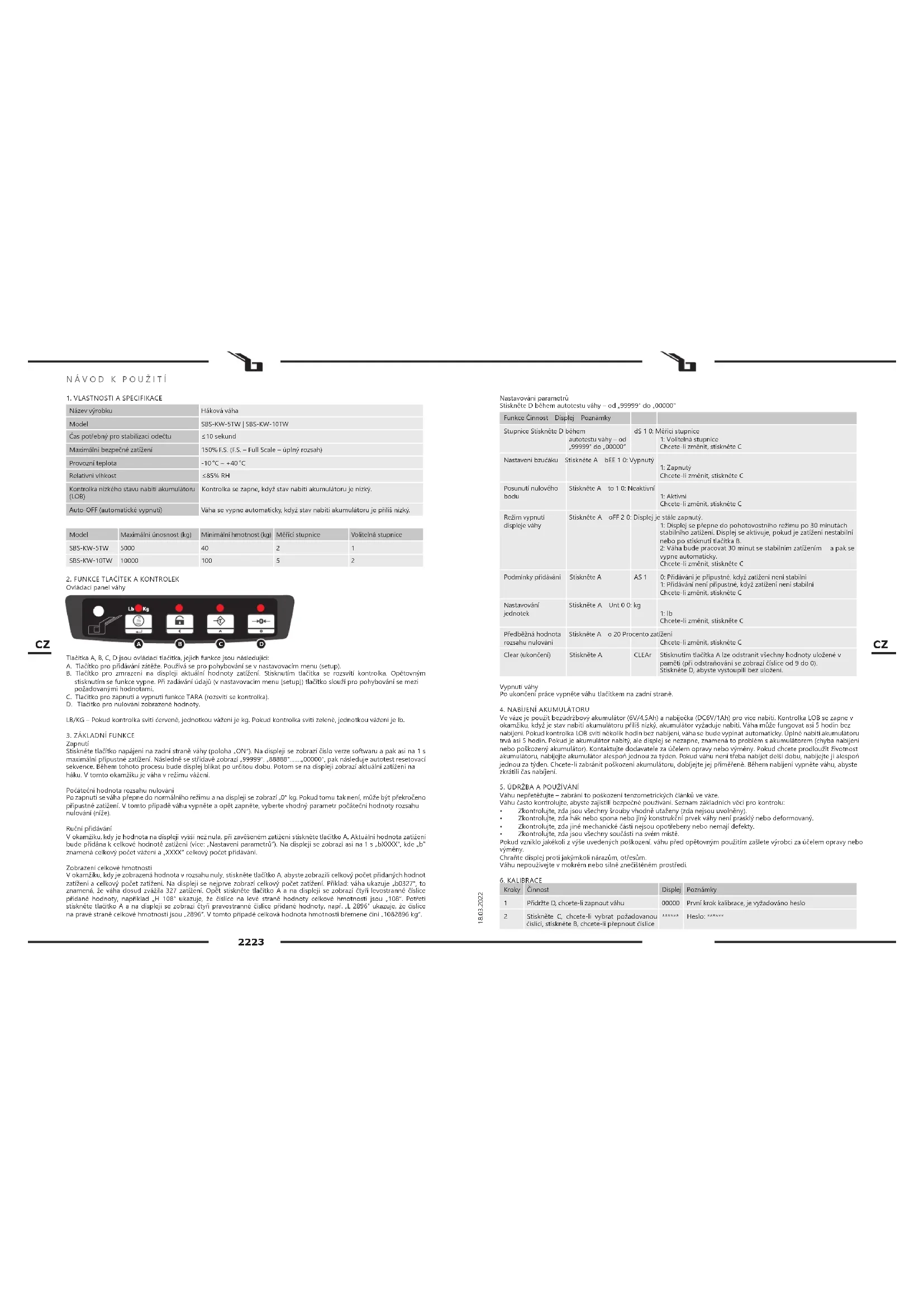 Název výrobku Háková váha Model SBS-KW-5TW | SBS-KW-10TW Čas potřebný pro stabilizaci odečtu ≤10 sekund Maximální bezpečné zatížení 150% F.S. (F.S. – Full Scale – úplný rozsah) Provozní teplota -10 °C ~ +40 °C Relativní vlhkost ≤85% RH Kontrolka nízkého stavu nabití akumulátoru (LOB) Kontrolka se zapne, když stav nabití akumulátoru je nízký. Auto-OFF (automatické vypnutí) Váha se vypne automaticky, když stav nabití akumulátoru je příliš nízký. Model Maximální únosnost (kg) Minimální hmotnost (kg) Měřící stupnice Volitelná stupnice SBS-KW-5TW 5000 40 2 1 SBS-KW-10TW 10000 100 5 2