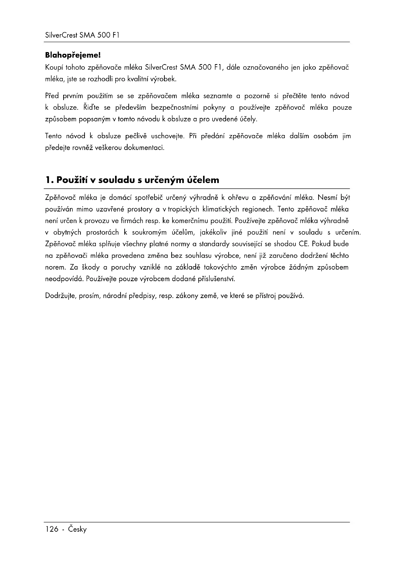 Blahopřejeme! Koupí tohoto zpěňovače mléka SilverCrest SMA 500 F1, dále označovaného jen jako zpěňovač mléka, jste se rozhodli pro kvalitní výrobek. Před prvním použitím se se zpěňovačem mléka seznamte a pozorně si přečtěte tento návod k obsluze. Řiďte se především bezpečnostními pokyny a používejte zpěňovač mléka pouze způsobem popsaným v tomto návodu k obsluze a pro uvedené účely. Tento návod k obsluze pečlivě uschovejte. Při předání zpěňovače mléka dalším osobám jim předejte rovněž veškerou dokumentaci.