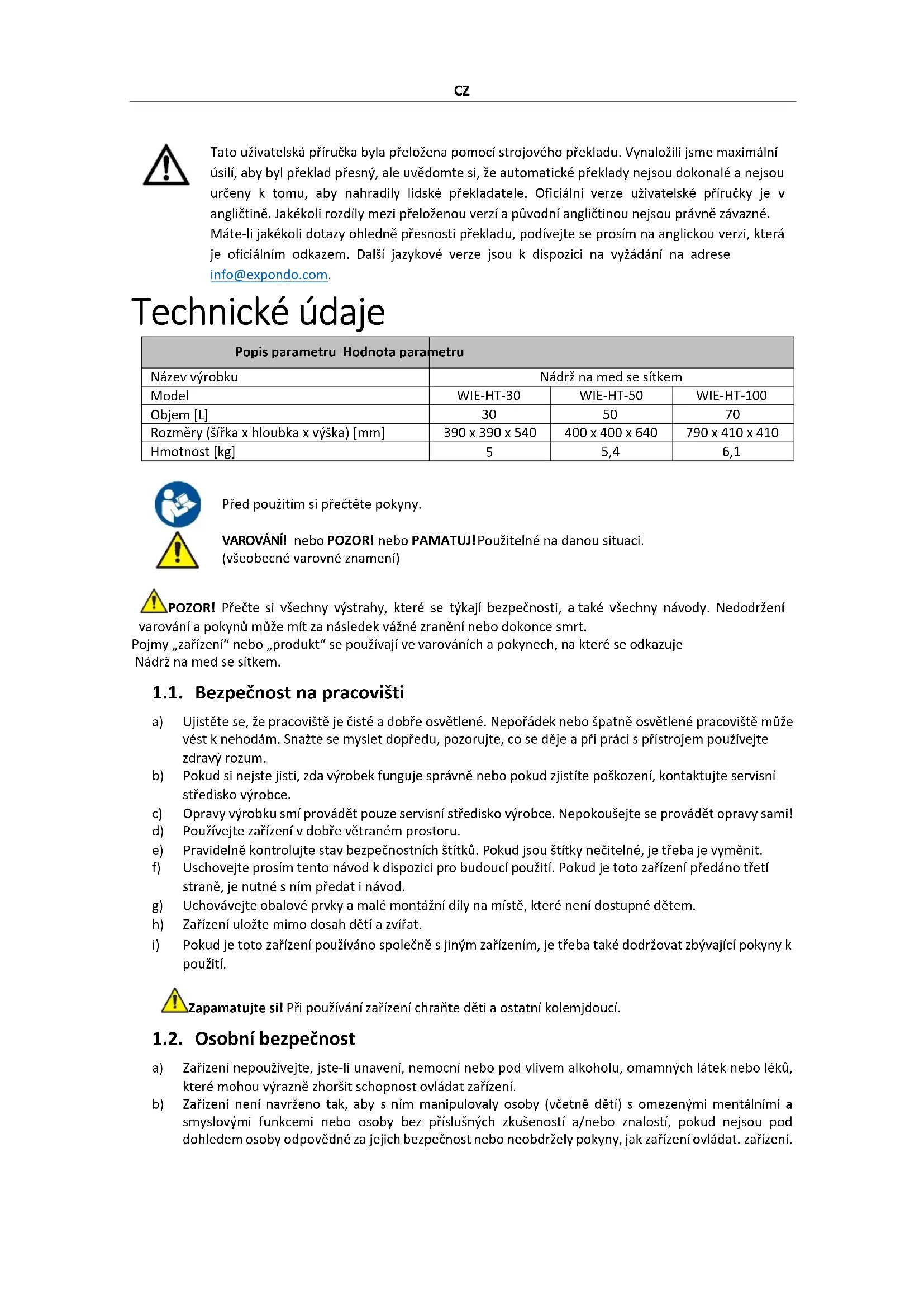 VAROVÁNÍ! nebo POZOR! nebo PAMATUJ! Použitelné na danou situaci. (všeobecné varovné znamení) POZOR! Přečte si všechny výstrahy, které se týkají bezpečnosti, a také všechny návody. Nedodržení varování a pokynů může mít za následek vážné zranění nebo dokonce smrt. Pojmy „zařízení“ nebo „produkt“ se používají ve varováních a pokynech, na které se odkazuje Nádrž na med se sítkem. 1.1. Bezpečnost na pracovišti a) Ujistěte se, že pracoviště je čisté a dobře osvětlené. Nepořádek nebo špatně osvětlené pracoviště může vést k nehodám. Snažte se myslet dopředu, pozorujte, co se děje a při práci s přístrojem používejte zdravý rozum. b) Pokud si nejste jisti, zda výrobek funguje správně nebo pokud zjistíte poškození, kontaktujte servisní středisko výrobce. c) Opravy výrobku smí provádět pouze servisní středisko výrobce. Nepokoušejte se provádět opravy sami! d) Používejte zařízení v dobře větraném prostoru. e) Pravidelně kontrolujte stav bezpečnostních štítků. Pokud jsou štítky nečitelné, je třeba je vyměnit. f) Uschovejte prosím tento návod k dispozici pro budoucí použití. Pokud je toto zařízení předáno třetí straně, je nutné s ním předat i návod. g) Uchovávejte obalové prvky a malé montážní díly na místě, které není dostupné dětem. h) Zařízení uložte mimo dosah dětí a zvířat.