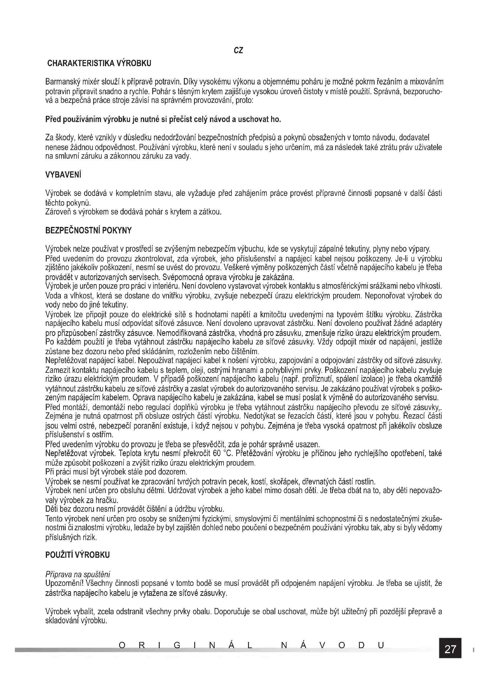 Výrobek nelze používat v prostředí se zvýšeným nebezpečím výbuchu, kde se vyskytují zápalné tekutiny, plyny nebo výpary. Před uvedením do provozu zkontrolovat, zda výrobek, jeho příslušenství a napájecí kabel nejsou poškozeny. Je-li u výrobku zjištěno jakékoliv poškození, nesmí se uvést do provozu. Veškeré výměny poškozených částí včetně napájecího kabelu je třeba provádět v autorizovaných servisech. Svépomocná oprava výrobku je zakázána. Výrobek je určen pouze pro práci v interiéru. Není dovoleno vystavovat výrobek kontaktu s atmosférickými srážkami nebo vlhkostí. Voda a vlhkost, která se dostane do vnitřku výrobku, zvyšuje nebezpečí úrazu elektrickým proudem. Neponořovat výrobek do vody nebo do jiné tekutiny. Výrobek lze připojit pouze do elektrické sítě s hodnotami napětí a kmitočtu uvedenými na typovém štítku výrobku. Zástrčka napájecího kabelu musí odpovídat síťové zásuvce. Není dovoleno upravovat zástrčku. Není dovoleno používat žádné adaptéry pro přizpůsobení zástrčky zásuvce. Nemodifi kovaná zástrčka, vhodná pro zásuvku, zmenšuje riziko úrazu elektrickým proudem. Po každém použití je třeba vytáhnout zástrčku napájecího kabelu ze síťové zásuvky. Vždy odpojit mixér od napájení, jestliže zůstane bez dozoru nebo před skládáním, rozložením nebo čištěním. Nepřetěžovat napájecí kabel. Nepoužívat napájecí kabel k nošení výrobku, zapojování a odpojování zástrčky od síťové zásuvky. Zamezit kontaktu napájecího kabelu s teplem, oleji, ostrými hranami a pohyblivými prvky. Poškození napájecího kabelu zvyšuje riziko úrazu elektrickým proudem. V případě poškození napájecího kabelu (např. proříznutí, spálení izolace) je třeba okamžitě vytáhnout zástrčku kabelu ze síťové zástrčky a zaslat výrobek do autorizovaného servisu. Je zakázáno používat výrobek s poško- zeným napájecím kabelem. Oprava napájecího kabelu je zakázána, kabel se musí poslat k výměně do autorizovaného servisu. Před montáží, demontáží nebo regulací doplňků výrobku je třeba vytáhnout zástrčku napájecího převodu ze síťové zásuvky,. Zejména je nutná opatrnost při obsluze ostrých částí výrobku. Nedotýkat se řezacích částí, které jsou v pohybu. Řezací části jsou velmi ostré, nebezpečí poranění existuje, i když nejsou v pohybu. Zejména je třeba vysoká opatrnost při jakékoliv obsluze příslušenství s ostřím. Před uvedením výrobku do provozu je třeba se přesvědčit, zda je pohár správně usazen. Nepřetěžovat výrobek. Teplota krytu nesmí překročit 60 °C. Přetěžování výrobku je příčinou jeho rychlejšího opotřebení, také může způsobit poškození a zvýšit riziko úrazu elektrickým proudem. Při práci musí být výrobek stále pod dozorem. Výrobek se nesmí používat ke zpracování tvrdých potravin pecek, kostí, skořápek, dřevnatých částí rostlin. Výrobek není určen pro obsluhu dětmi. Udržovat výrobek a jeho kabel mimo dosah dětí. Je třeba dbát na to, aby děti nepovažo- valy výrobek za hračku. Děti bez dozoru nesmí provádět čištění a údržbu výrobku. Tento výrobek není určen pro osoby se sníženými fyzickými, smyslovými či mentálními schopnostmi či s nedostatečnými zkuše- nostmi či znalostmi výrobku, ledaže by byl zajištěn dohled nebo poučení o bezpečném používání výrobku tak, aby si byly vědomy příslušných rizik.