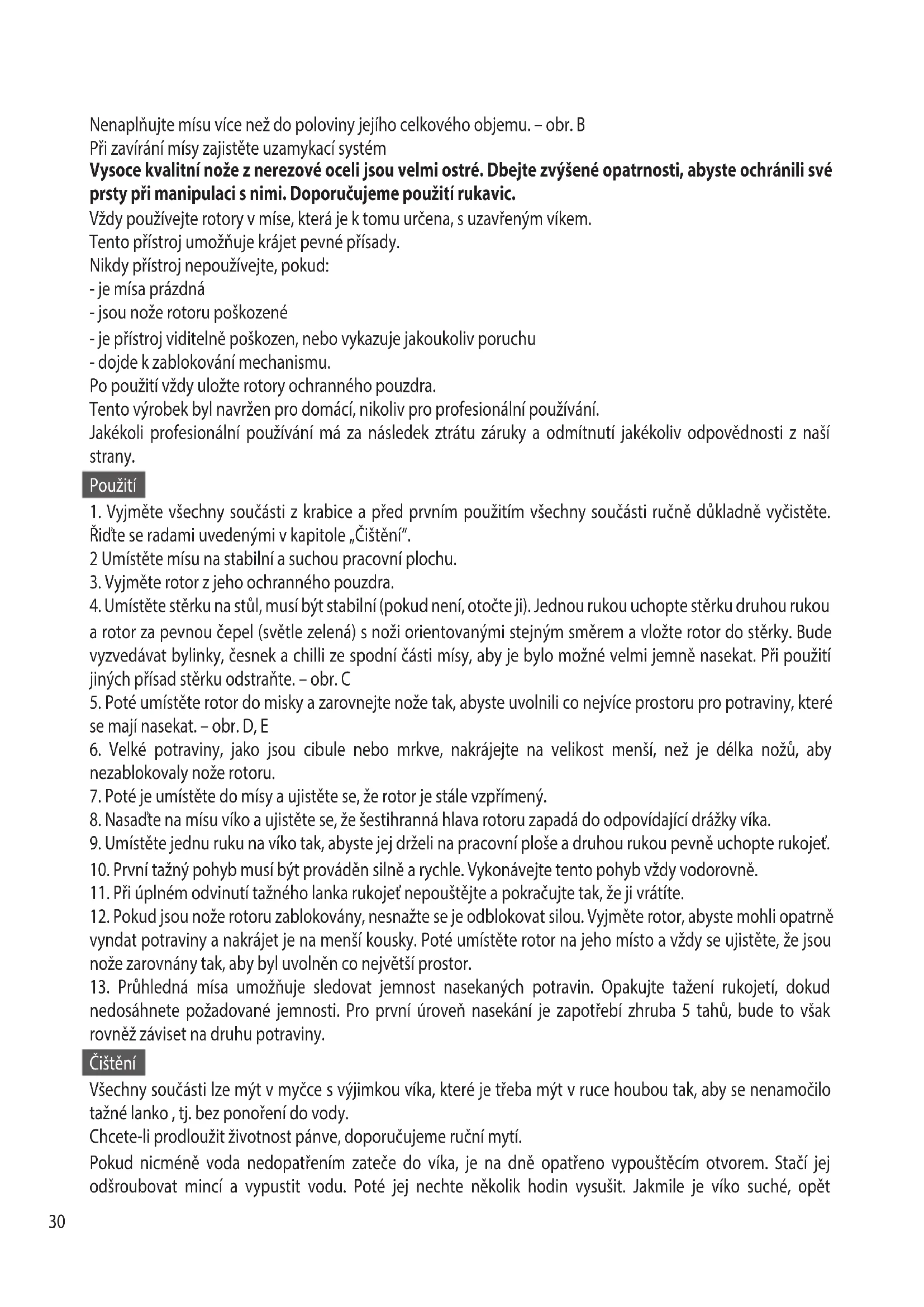 Děkujeme Vám za nákup mixéru Tefal® 5 Seconds. Součástí balení tohoto manuálního mixéru je: obr. A - 1 protiskluzová mísa o objemu 900 ml - 1 víko, jehož součástí je tažný mechanismus a uzamykací systém - 1 patentovaný rotor sestávající ze dvou nezávislých nožů z nerezové oceli - obr. W; pro krájení ovoce, zeleniny, ořechů a bylin (jablka, jahody, rajčata, okurky, ořechy, petržel,...). - 1 stěrka, která se připevňuje pod rotor pro nasekání bylin a provzdušnění receptu – obr. C. Opatření pro použití Pro zajištění nejlepšího výsledku naplňte mísu do poloviny předem nakrájenými kusy zbavenými slupky. Nepoužívejte na maso s kostmi, trvale byste poškodili nože. Bezpečnostní pokyny Tyto nože musejí být používány výlučně s MIXÉREM Tefal® 5 SECONDS 900 ml. Tento přístroj nesmí používat děti nebo osoby se zdravotním postižením v rozporu se zásadami bezpečného používání. Tento přístroj není hračka. Uchovávejte jej mimo dosah dětí. Tento přístroj používejte na stabilní a suché pracovní ploše. CST-13-17-000496D MANUAL_CHOPPER 900 Use&care.indd 29 27/01/2020 15:0430 Nenaplňujte mísu více než do poloviny jejího celkového objemu. – obr. B Při zavírání mísy zajistěte uzamykací systém Vysoce kvalitní nože z nerezové oceli jsou velmi ostré. Dbejte zvýšené opatrnosti, abyste ochránili své prsty při manipulaci s nimi. Doporučujeme použití rukavic. Vždy používejte rotory v míse, která je k tomu určena, s uzavřeným víkem. Tento přístroj umožňuje krájet pevné přísady. Nikdy přístroj nepoužívejte, pokud: - je mísa prázdná - jsou nože rotoru poškozené - je přístroj viditelně poškozen, nebo vykazuje jakoukoliv poruchu - dojde k zablokování mechanismu. Po použití vždy uložte rotory ochranného pouzdra. Tento výrobek byl navržen pro domácí, nikoliv pro profesionální používání. Jakékoli profesionální používání má za následek ztrátu záruky a odmítnutí jakékoliv odpovědnosti z naší strany. Použití