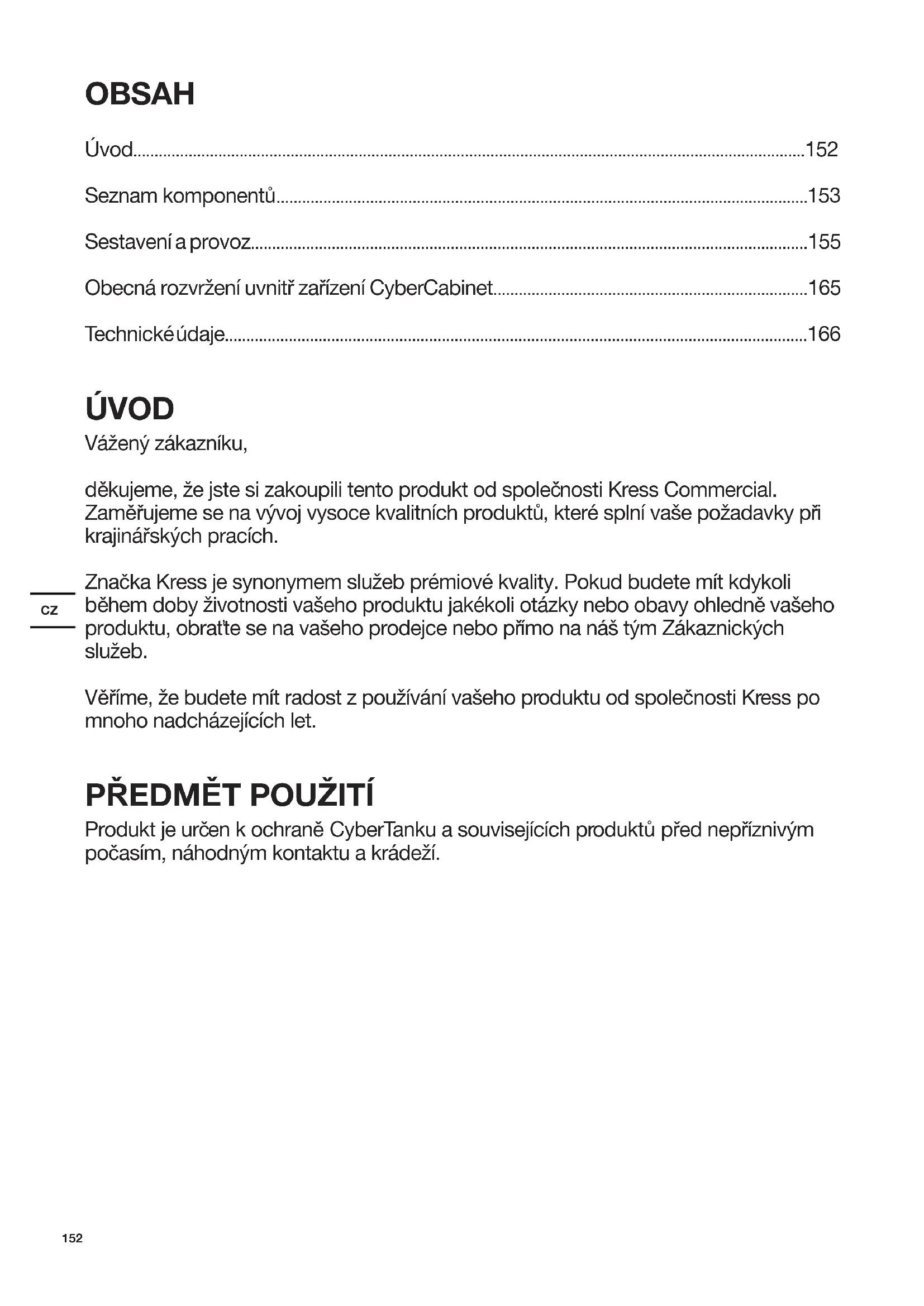 - Technické údaje ÚVOD Vážený zákazníku, dČkujeme, že jste si zakoupili tento produkt od spoleþnosti Kress Commercial. ZamČĜujeme se na vývoj vysoce kvalitních produktĤ, které splní vaše požadavky pĜi krajináĜských pracích. Znaþka Kress je synonymem služeb prémiové kvality. Pokud budete mít kdykoli bČhem doby životnosti vašeho produktu jakékoli otázky nebo obavy ohlednČ vašeho produktu, obraĢte se na vašeho prodejce nebo pĜímo na náš tým Zákaznických služeb. VČĜíme, že budete mít radost z používání vašeho produktu od spoleþnosti Kress po mnoho nadcházejících let. PěEDMċT POUŽITÍ Produkt je urþen k ochranČ CyberTanku a souvisejících produktĤ pĜed nepĜíznivým poþasím, náhodným kontaktu a krádeží.CZ p. 166