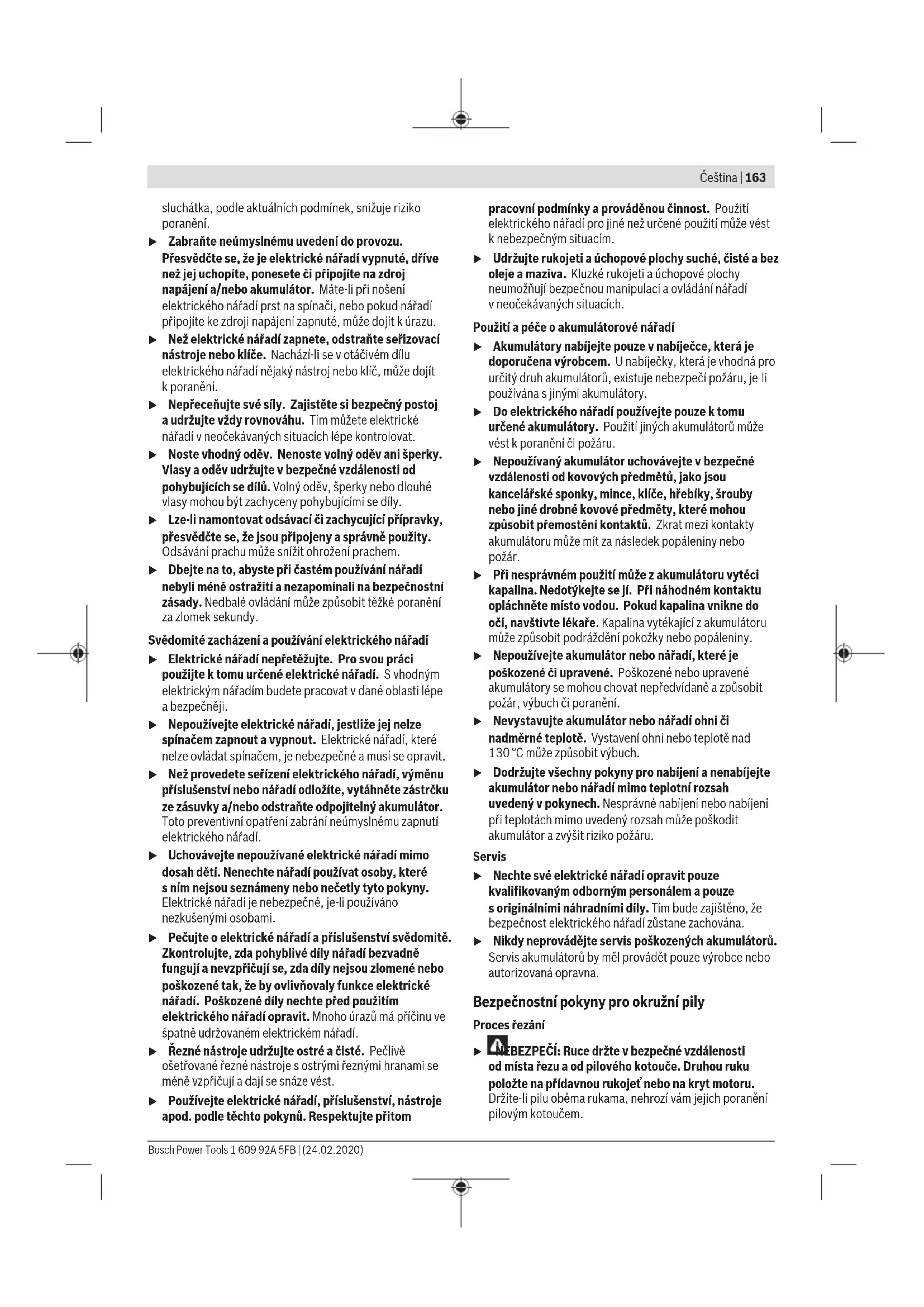 Za pomocą szyny prowadzącej (41) można wykonać cięcia w linii prostej. Odpowiednia wykładzina na listwie prowadzącej zapobiega ślizganiu się jej po powierzchni przedmiotu nie powodując jednocześnie jej uszkodzeń. Specjalna powłoka na szynie prowadzącej zapewnia łatwe przemieszczanie elektronarzę- dzia. Pilarkę tarczową należy przystawić bezpośrednio do szyny prowadzącej (41). Szynę prowadzącą (41) należy przymo- cować do obrabianego materiału za pomocą odpowiednich urządzeń mocujących, np. ścisków stolarskich, w taki spo- sób, aby wąskie ramię szyny (41) zwrócone było w kierunku tarczy. Szyna prowadząca (41) nie może wystawać od strony przecinanego elementu. Włączyć elektronarzędzie i z lekkim równomiernym posu- wem prowadzić je przez materiał. Złączka (43) umożliwia połączenie dwóch szyn prowadzą- cych. Połączenie następuje za pomocą czterech, znajdują- cych się w złączce śrub. Rowek (44) jest przeznaczony do systemów szyn prowadzą- cych firm Bosch i Mafell. Rowek (45) jest przeznaczony do systemów szyn prowadzą- cych firm Festool i Makita. Wskazówki dotyczące właściwego postępowania z akumulatorem Akumulator należy chronić przed wilgocią iwodą. Akumulator należy przechowywać wyłącznie wtemperaturze od –20°C do 50°C. Nie wolno pozostawiać akumulatora, np. latem, w samochodzie. Otwory wentylacyjne należy regularnie czyścić za pomocą miękkiego, czystego i suchego pędzelka. Zdecydowanie krótszy czas pracy po ładowaniu wskazuje na zużycie akumulatora i konieczność wymiany na nowy. Przestrzegać wskazówek dotyczących utylizacji odpadów. Konserwacja i serwis Konserwacja i czyszczenie u Przed przystąpieniem do jakichkolwiek prac przy elektronarzędziu (np. prace konserwacyjne, wymiana osprzętu itp.), a także na czas transportu i przechowy- wania należy wyjąć z niego akumulator. Niezamierzone uruchomienie włącznika/wyłącznika grozi skaleczeniem. u Utrzymywanie urządzenia i szczelin wentylacyjnych w czystości gwarantuje prawidłową i bezpieczną pracę. Osłona musi zawsze swobodnie się poruszać i samoczynnie zamykać. Dlatego też należy zawsze utrzymywać zakres jej ruchu w czystości. Kurz i wióry należy usuwać za pomocą miękkiego pędzelka. Tarcze bez powłok ochronnych można chronić przed korozją poprzez nałożenie cienkiej warstwy oleju bezkwasowego. Przed przystąpieniem do cięcia należy usunąć olej, gdyż mo- że on zabrudzić drewno. Resztki żywicy i kleju na tarczy obniżają jakość cięcia. Dlate- go należy po każdym użyciu oczyścić tarczę. Obsługa klienta oraz doradztwo dotyczące użytkowania Ze wszystkimi pytaniami, dotyczącymi naprawy ikonserwa- cji nabytego produktu oraz dostępu do części zamiennych, prosimy zwracać się do punktów obsługi klienta. Rysunki techniczne oraz informacje o częściach zamiennych można znaleźć pod adresem: www.bosch-pt.com Nasz zespół doradztwa dotyczącego użytkowania odpowie na wszystkie pytania związane z produktami firmy Bosch oraz ich osprzętem. Przy wszystkich zgłoszeniach oraz zamówieniach części za- miennych konieczne jest podanie 10‑cyfrowego numeru ka- talogowego, znajdującego się na tabliczce znamionowej pro- duktu. Polska Robert Bosch Sp. z o.o. Serwis Elektronarzędzi Ul. Jutrzenki 102/104 02-230 Warszawa Na www.serwisbosch.com znajdą Państwo wszystkie szcze- góły dotyczące usług serwisowych online. Tel.: 22 7154450 Faks: 22 7154440 E-Mail: bsc@pl.bosch.com www.bosch-pt.pl Bosch Power Tools 1 609 92A 5FB | (24.02.2020)162 | Čeština Transport Załączone w dostawie akumulatory litowo-jonowe podlegają wymaganiom przepisów dotyczących towarów niebezpiecz- nych. Akumulatory mogą być transportowane drogą lądową przez użytkownika, bez konieczności spełnienia jakichkol- wiek dalszych warunków. W przypadku przesyłki przez osoby trzecie (np. transport drogą powietrzną lub za pośrednictwem firmy spedycyjnej) należy dostosować się do szczególnych wymogów dotyczą- cych opakowania i oznakowania towaru. W takim wypadku podczas przygotowywania towaru do wysyłki należy skonsul- tować się z ekspertem ds. towarów niebezpiecznych. Akumulatory można wysyłać tylko wówczas, gdy ich obudo- wa nie jest uszkodzona. Odsłonięte styki należy zakleić, a akumulator zapakować wtaki sposób, aby nie mógł on się poruszać (przesuwać) w opakowaniu. Należy wziąć też pod uwagę ewentualne inne przepisy prawa krajowego. Utylizacja odpadów Elektronarzędzia, akumulatory, osprzęt i opa- kowanie należy oddać do powtórnego przetwo- rzenia zgodnego z obowiązującymi przepisami w zakresie ochrony środowiska. Elektronarzędzia i akumulatora/baterii nie wol- no wyrzucać do odpadów domowych! Tylko dla krajów UE: Zgodnie z europejską dyrektywą 2012/19/UE niezdatne do użytku elektronarzędzia, a zgodnie z europejską dyrektywą 2006/66/WE uszkodzone lub zużyte akumulatory/baterie, należy zbierać osobno i doprowadzić do ponownego prze- tworzenia zgodnie z przepisami ochrony środowiska. Akumulatory/baterie: Li-Ion: Prosimy postępować zgodnie ze wskazówkami umieszczony- mi w rozdziale Transport (zob. „Transport“, Strona162). Čeština Bezpečnostní upozornění Obecné bezpečnostní pokyny pro elektrické nářadí VÝSTRAHA Prostudujte si všechny bezpečnostní výstrahy, pokyny, ilustrace aspecifikace ktomuto elektrickému nářadí. Nedodržování všech níže uvedených pokynů může mít za následek úraz elektrickým proudem, požár a/nebo těžké poranění. Všechna varovná upozornění apokyny do budoucna uschovejte. Vupozorněních použitý pojem „elektrické nářadí“ se vztahuje na elektrické nářadí napájené ze sítě (se síťovým kabelem) ana elektrické nářadí napájené akumulátorem (bez síťového kabelu). Bezpečnost pracoviště u Udržujte pracoviště včistotě adobře osvětlené. Nepořádek nebo neosv