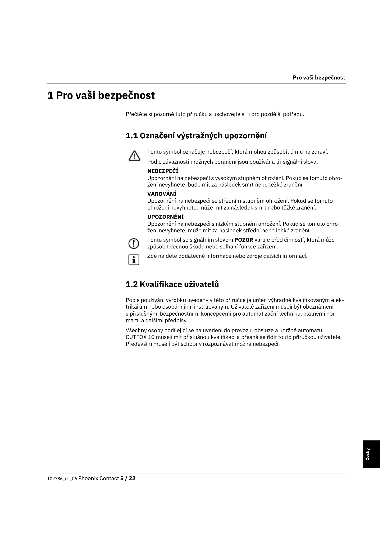 Popis používání výrobku uvedený v této příručce je určen výhradně kvalifikovaným elek- trikářům nebo osobám jimi instruovaným. Uživatelé zařízení musejí být obeznámeni s příslušnými bezpečnostními koncepcemi pro automatizační techniku, platnými nor- mami a dalšími předpisy. Všechny osoby podílející se na uvedení do provozu, obsluze a údržbě automatu CUTFOX 10 musejí mít příslušnou kvalifikaci a přesně se řídit touto příručkou uživatele. Především musejí být schopny rozpoznávat možná nebezpečí. Tento symbol označuje nebezpečí, která mohou způsobit újmu na zdraví. Podle závažnosti možných poranění jsou používána tři signální slova. NEBEZPEČÍ Upozornění na nebezpečí s vysokým stupněm ohrožení. Pokud se tomuto ohro- žení nevyhnete, bude mít za následek smrt nebo těžké zranění. VAROVÁNÍ Upozornění na nebezpečí se středním stupněm ohrožení. Pokud se tomuto ohrožení nevyhnete, může mít za následek smrt nebo těžké zranění. UPOZORNĚNÍ Upozornění na nebezpečí s nízkým stupněm ohrožení. Pokud se tomuto ohro- žení nevyhnete, může mít za následek střední nebo lehké zranění. Tento symbol se signálním slovem POZOR varuje před činností, která může způsobit věcnou škodu nebo selhání funkce zařízení. Zde najdete dodatečné informace nebo zdroje dalších informací.CUTFOX 10 6 / 22 Phoenix Contact 102786_cs_06