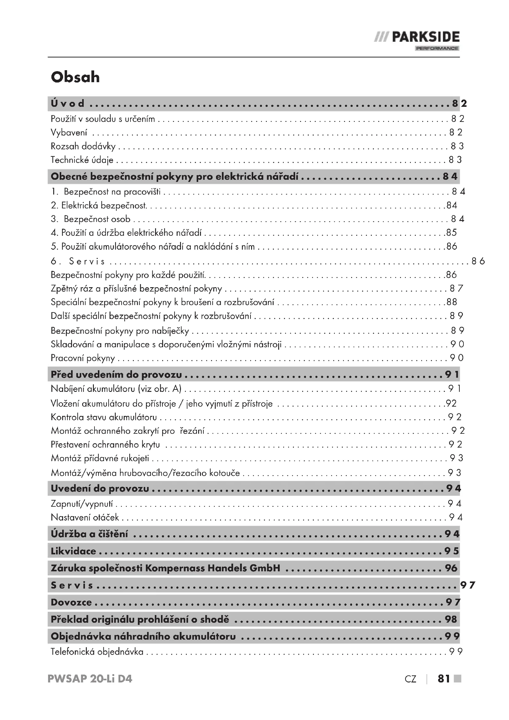 CZ Záruka společnosti Kompernass Handels GmbH Vážená zákaznice, vážený zákazníku, na tento přístroj získáváte záruku v trvání 5 let od data zakoupení. V případě závad na tomto výrob- ku máte zákonná práva vůči prodejci výrobku. Tato zákonná práva nejsou omezena naší níže uvede- nou zárukou. Záruční podmínky Záruční doba začíná plynout dnem nákupu. Dobře uschovejte pokladní doklad. Tento doklad je po- třebný jako důkaz o koupi. Pokud se do 5 let od data zakoupení tohoto výrob- ku vyskytne vada materiálu nebo výrobní závada, pak vám podle našeho uvážení výrobek zdarma opravíme, vyměníme nebo uhradíme kupní cenu. Předpokladem této záruky je, že bude během 5leté lhůty předložen vadný přístroj a doklad okoupi (pokladní doklad) a stručně se popíše, včem záva- da spočívá a kdy se vyskytla. Vztahuje-li se na závadu naše záruka, obdržíte zpět buď opravený nebo nový produkt. Opravou nebo výměnou výrobku nezačne plynout nová záruční doba. Na akumulátor řady X 20 V Team 3 získáváte záruku vtrvání 3let od data zakoupení. Záruční doba a zákonné nároky vyplývající ze závad Záručním plněním se záruční doba neprodlužuje. To platí ipro vyměněné a opravené součásti. Po- škození nebo vady vyskytující se případně již při nákupu se musí oznámit ihned po vybalení. Po uplynutí záruční doby podléhají veškeré opravy zpoplatnění. Rozsah záruky Přístroj byl vyroben pečlivě podle přísných směrnic kvality a před expedicí byl svědomitě vyzkoušen. Záruka se vztahuje na materiálové nebo výrobní vady. Tato záruka se nevztahuje na součásti výrobku, které jsou vystaveny běžnému opotřebení, a proto je lze považovat za spotřební díly, nebo na poškození křehkých součástí, jako jsou např. spínače nebo díly, které jsou vyrobeny ze skla. Tato záruka zaniká, pokud je výrobek poškozen, nebyl řádně používán nebo udržován. Pro zajištění správného používání výrobku se musí přesně dodr- žovat všechny pokyny uvedené v návodu kobslu- ze. Účelům použití a úkonům, které se v návodu kobsluze nedoporučují nebo se před nimi varuje, je třeba se bezpodmínečně vyhnout. Výrobek je určen pouze pro soukromé účely a ne pro komerční použití. Při nesprávném a neodbor- ném používání, při použití násilí a při zásazích, které nebyly provedeny našimi autorizovanými servisními provozovnami, záruční nároky zanikají. Záruční lhůta neplatí v těchto případech ■ normální opotřebení kapacity akumulátoru ■ komerční použití výrobku ■ poškození nebo změna výrobku zákazníkem ■ nedodržení bezpečnostních předpisů apředpisů údržby, chyby obsluhy ■ škody vlivem přírodních živlůPWSAP 20-Li D4 CZ