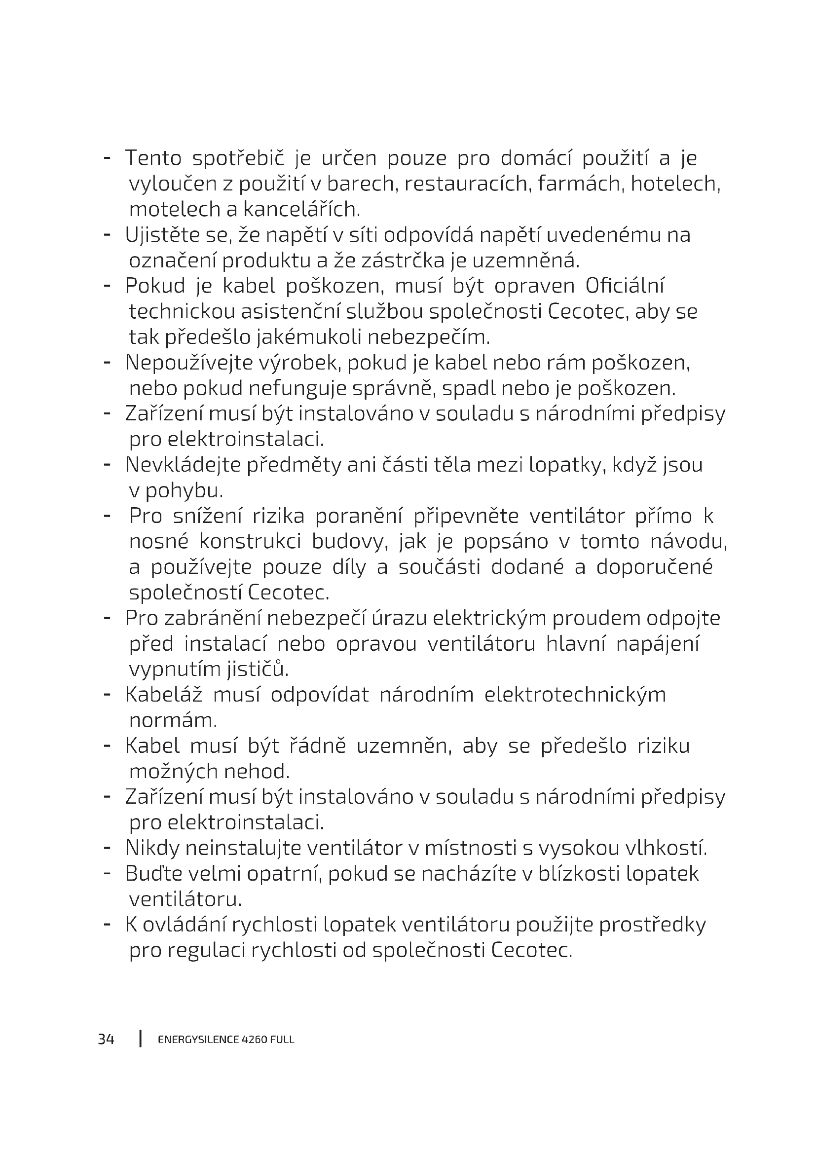 Přečtěte si pozorně následující pokyny před použitím výrobku. Uschovejte tento návod pro budoucí použití nebo pro nové uživatele. - Tento spotřebič mohou používat děti od 8 let a starší a osoby se sníženými fyzickými, smyslovými nebo duševními schopnostmi nebo s nedostatkem zkušeností a znalostí, pokud jsou pod dohledem nebo byly poučeny o bezpečném používání spotřebiče a rozumí souvisejícím nebezpečím. Děti si se spotřebičem nesmí hrát. Čištění a údržbu, kterou má provádět uživatel, nesmí provádět děti bez dozoru. - Minimální vzdálenost mezi lopatkami ventilátoru a podlahou musí být 2,3 metru. - Minimální vzdálenost od jakéhokoli předmětu nebo zdi od lopatek musí být minimálně 76 cm. - Ujistěte se, že je spotřebič před čištěním nebo uživatelskou údržbou odpojen od napájení.34 ENERGYSILENCE 4260 FULL - Tento spotřebič je určen pouze pro domácí použití a je vyloučen z použití v barech, restauracích, farmách, hotelech, motelech a kancelářích. - Ujistěte se, že napětí v síti odpovídá napětí uvedenému na označení produktu a že zástrčka je uzemněná. - Pokud je kabel poškozen, musí být opraven Ociální technickou asistenční službou společnosti Cecotec, aby se tak předešlo jakémukoli nebezpečím. - Nepoužívejte výrobek, pokud je kabel nebo rám poškozen, nebo pokud nefunguje správně, spadl nebo je poškozen. - Zařízení musí být instalováno v souladu s národními předpisy pro elektroinstalaci. - Nevkládejte předměty ani části těla mezi lopatky, když jsou v pohybu. - Pro snížení rizika poranění připevněte ventilátor přímo k nosné konstrukci budovy, jak je popsáno v tomto návodu, a používejte pouze díly a součásti dodané a doporučené společností Cecotec. - Pro zabránění nebezpečí úrazu elektrickým proudem odpojte před instalací nebo opravou ventilátoru hlavní napájení vypnutím jističů. - Kabeláž musí odpovídat národním elektrotechnickým normám. - Kabel musí být řádně uzemněn, aby se předešlo riziku možných nehod. - Zařízení musí být instalováno v souladu s národními předpisy pro elektroinstalaci. - Nikdy neinstalujte ventilátor v místnosti s vysokou vlhkostí. - Buďte velmi opatrní, pokud se nacházíte v blízkosti lopatek ventilátoru. - K ovládání rychlosti lopatek ventilátoru použijte prostředky pro regulaci rychlosti od společnosti Cecotec.ENERGYSILENCE 4260 FULL