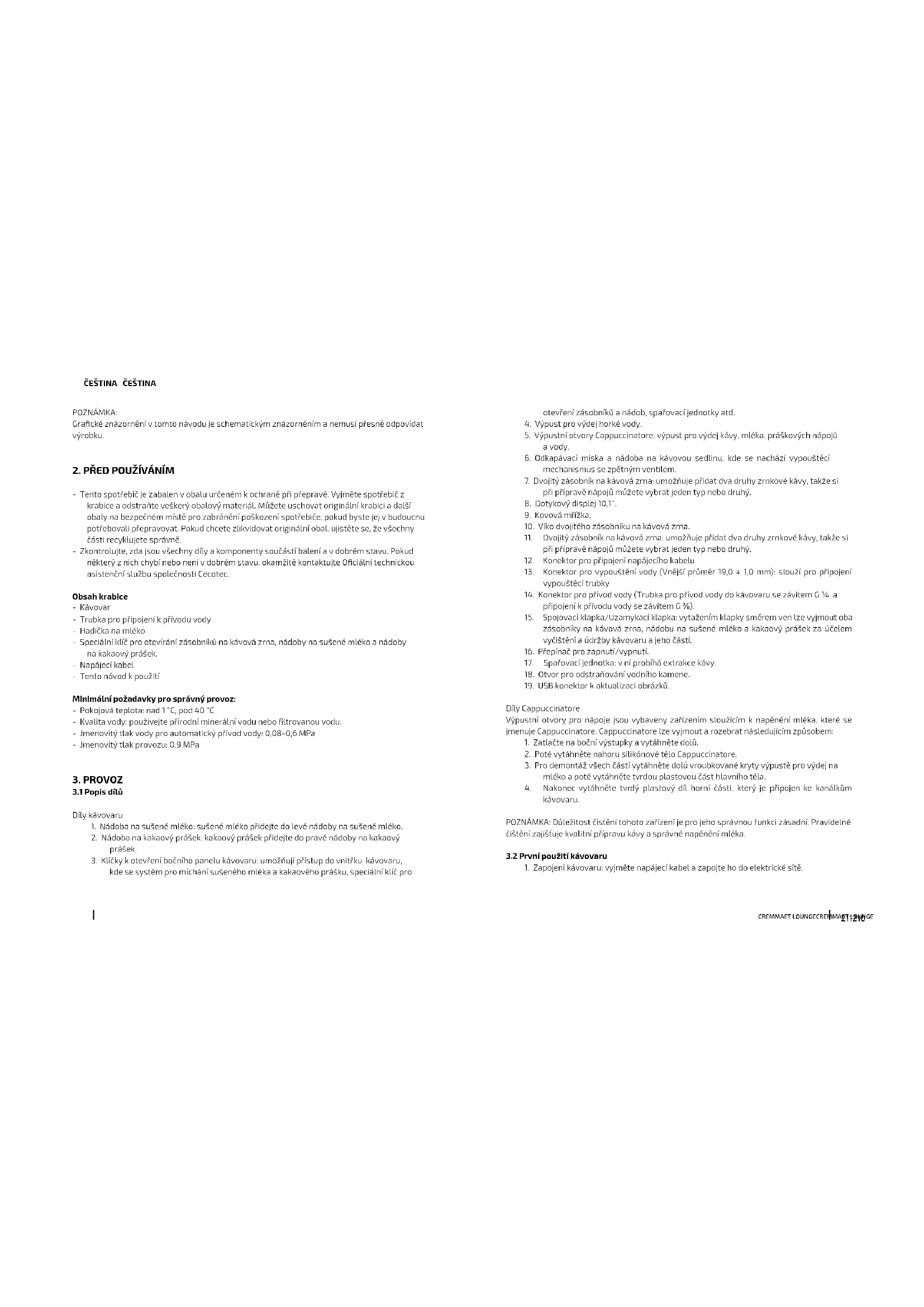 - Tento spotřebič je zabalen v obalu určeném k ochraně při přepravě. Vyjměte spotřebič z krabice a odstraňte veškerý obalový materiál. Můžete uschovat originální krabici a další obaly na bezpečném místě pro zabránění poškození spotřebiče, pokud byste jej v budoucnu potřebovali přepravovat. Pokud chcete zlikvidovat originální obal, ujistěte se, že všechny části recyklujete správně. - Zkontrolujte, zda jsou všechny díly a komponenty součástí balení a v dobrém stavu. Pokud některý z nich chybí nebo není v dobrém stavu, okamžitě kontaktujte Ociální technickou asistenční službu společnosti Cecotec. Obsah krabice - Kávovar - Trubka pro připojení k přívodu vody - Hadička na mléko - Speciální klíč pro otevírání zásobníků na kávová zrna, nádoby na sušené mléko a nádoby na kakaový prášek. - Napájecí kabel - Tento návod k použití Minimální požadavky pro správný provoz: - Pokojová teplota: nad 1 °C, pod 40 °C - Kvalita vody: používejte přírodní minerální vodu nebo ltrovanou vodu. - Jmenovitý tlak vody pro automatický přívod vody: 0,08-0,6 MPa - Jmenovitý tlak provozu: 0,9 MPa
