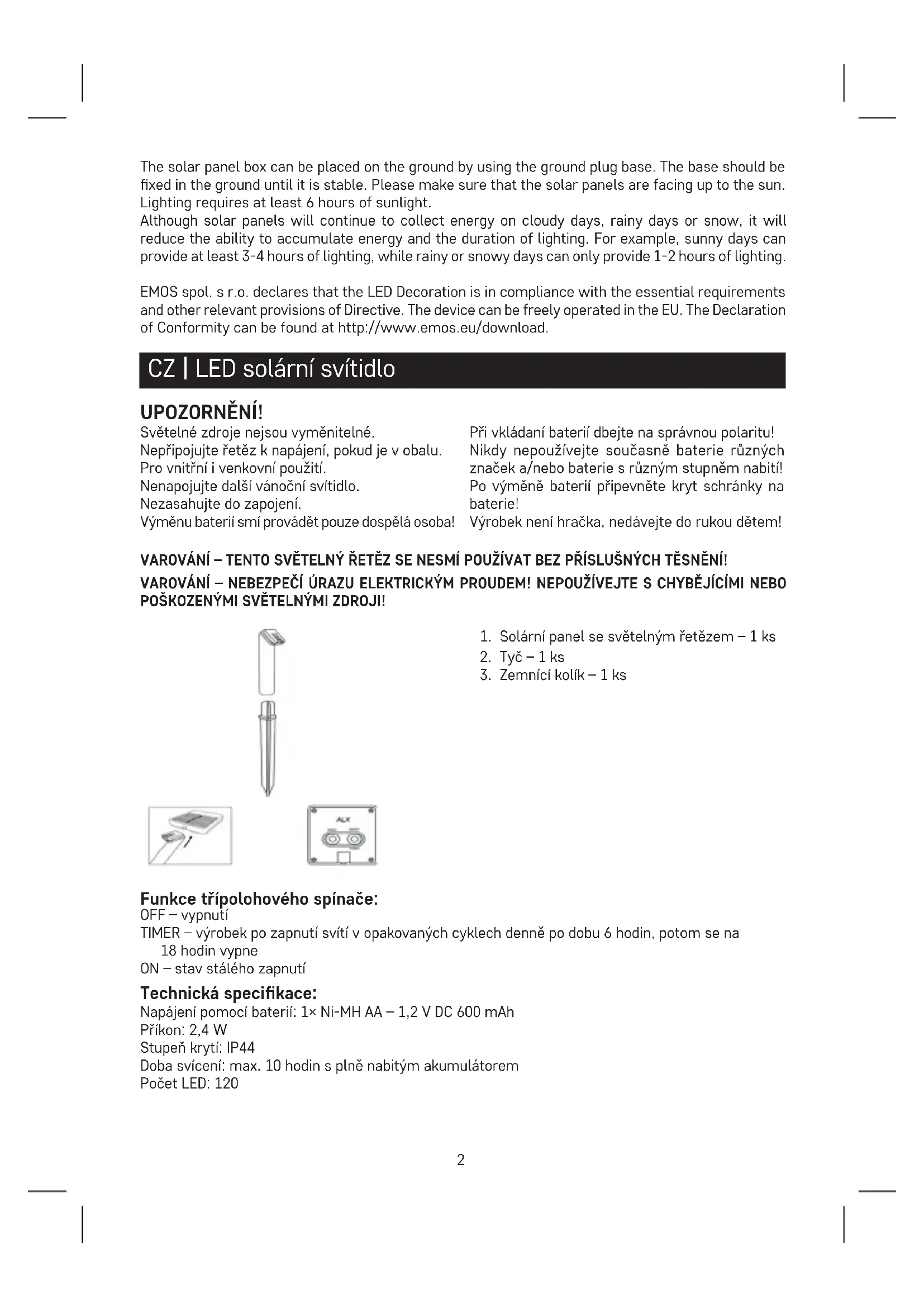 Funkce třípolohového spínače: OFF – vypnutí TIMER – výrobek po zapnutí svítí v opakovaných cyklech denně po dobu 6 hodin, potom se na 18 hodin vypne ON – stav stálého zapnutí Technická specikace: Napájení pomocí baterií: 1× Ni-MH AA – 1,2 V DC 600 mAh Příkon: 2,4 W Stupeň krytí: IP44 Doba svícení: max. 10 hodin s plně nabitým akumulátorem Počet LED: 1203 Použití: Řetěz lze zapnout a vypnout stisknutím tlačítka ON/OFF (POWER). Stisknutím tlačítka „TIMER“ aktivujete funkci časovače. Světelný řetěz krátce zabliká, aby potvrdil, že je časovač aktivován. Opětovným stisknutím tlačítka „TIMER“ funkci časovače deaktivujete. Solární panel musí být instalován na dobře osvětleném místě, kde může během dne přijímat maximum slunečního světla. Jakákoli sluneční clona na panelu sníží jeho schopnost absorbovat sluneční světlo a sníží jas a životnost LED svítidla. Solární panely by neměly být na místě, kde by je mohl ovlivnit déšť nebo sníh. Tento světelný řetěz lze zavěsit na větve, keře, střechy, okapy, ploty nebo jakékoli jiné místo, které chcete. Box solárního panelu lze umístit na zem pomocí zemnící základny. Základna by měla být stabilně upevněna v zemi. Ujistěte se, že solární panely směřují ke slunci. Osvětlení vyžaduje alespoň 6 hodin slunečního záření. Přestože solární panely budou i nadále shromažďovat energii v zatažených dnech, deštivých dnech nebo sněžení, sníží se schopnost akumulace energie a doba svícení. Například slunečné dny mohou poskytnout alespoň 3-4 hodiny osvětlení, zatímco deštivé nebo zasněžené dny mohou poskytnout pouze 1-2 hodiny osvětlení. EMOS spol. s r.o. prohlašuje, že LED solární svítidlo je ve shodě se základními požadavky a dalšími příslušnými ustanoveními směrnice. Zařízení lze volně provozovat v EU. Prohlášení o shodě lze najít na webových stránkách http://www.emos.eu/download. SK | LED solárne svietidlo UPOZORNENIE! Svetelné zdroje nie sú vymeniteľné. Reťaz nepripájajte k zdroju napájania, kým je v obale. Na vnútorné a vonkajšie použitie. Nepripájajte iné vianočné osvetlenie. Nezasahujte do elektroinštalácie. Batérie môže vymieňať len dospelá osoba! Pri vkladaní batérií dbajte na správnu polaritu! Nikdy nepoužívajte súčasne batérie rôznych značiek a/alebo batérie s rôznym stupňom nabitia! Po výmene batérií nasaďte kryt na batérie! Výrobok nie je hračka, nedávajte ho do rúk deťom! UPOZORNENIE – TÁTO SVETELNÁ REŤAZ SA NESMIE POUŽÍVAŤ BEZ PRÍSLUŠNÝCH TESNENÍ! VAROVANIE – NEBEZPEČENSTVO PORANENIA ELEKTRICKÝM PRÚDOM! NEPOUŽÍVAJTE S CHÝBA- JÚCIMI ALEBO POŠKODENÝMI ZDROJMI SVETLA!