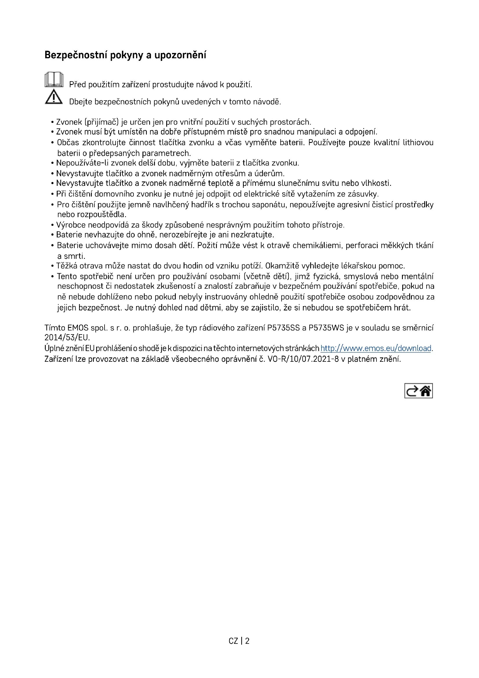 - Tento spotřebič není určen pro používání osobami (včetně dětí), jimž fyzická, smyslová nebo mentální neschopnost či nedostatek zkušeností a znalostí zabraňuje v bezpečném používání spotřebiče, pokud na ně nebude dohlíženo nebo pokud nebyly instruovány ohledně použití spotřebiče osobou zodpovědnou za jejich bezpečnost. Je nutný dohled nad dětmi, aby se zajistilo, že si nebudou se spotřebičem hrát. Tímto EMOS spol. s r. o. prohlašuje, že typ rádiového zařízení P5735SS a P5735WS je v souladu se směrnicí 2014/53/EU. Úplné znění EU prohlášení o shodě je k dispozici na těchto internetových stránkách http://www.emos.eu/download. Zařízení lze provozovat na základě všeobecného oprávnění č. VO-R/10/07.2021-8 v platném znění.CZ | 3 80 mm 38 mm 19 mm 65 mm 80 mm 92 mm Technická specikace Dosah vysílání: až 150 m ve volném prostoru (v zastavěném prostoru může klesnout až na pětinu) Tlačítko: voděodolné; krytí IP44 Párování zvonku s tlačítky: funkce „self-learning“ Kapacita párování: maximálně 8 tlačítek na 1 zvonek, maximálně 2 tlačítka na 1 zvonek vaplikaci EMOS GoSmart Počet melodií: 52 Frekvence přenosu: 433,92 MHz, 10 mW e.r.p. max. Napájení zvonku: 230 V AC/50 Hz Napájení tlačítka: baterie 1× 3 V (typ CR2032, součást dodávky) Součást dodávky: oboustranná lepicí páskaCZ | 4