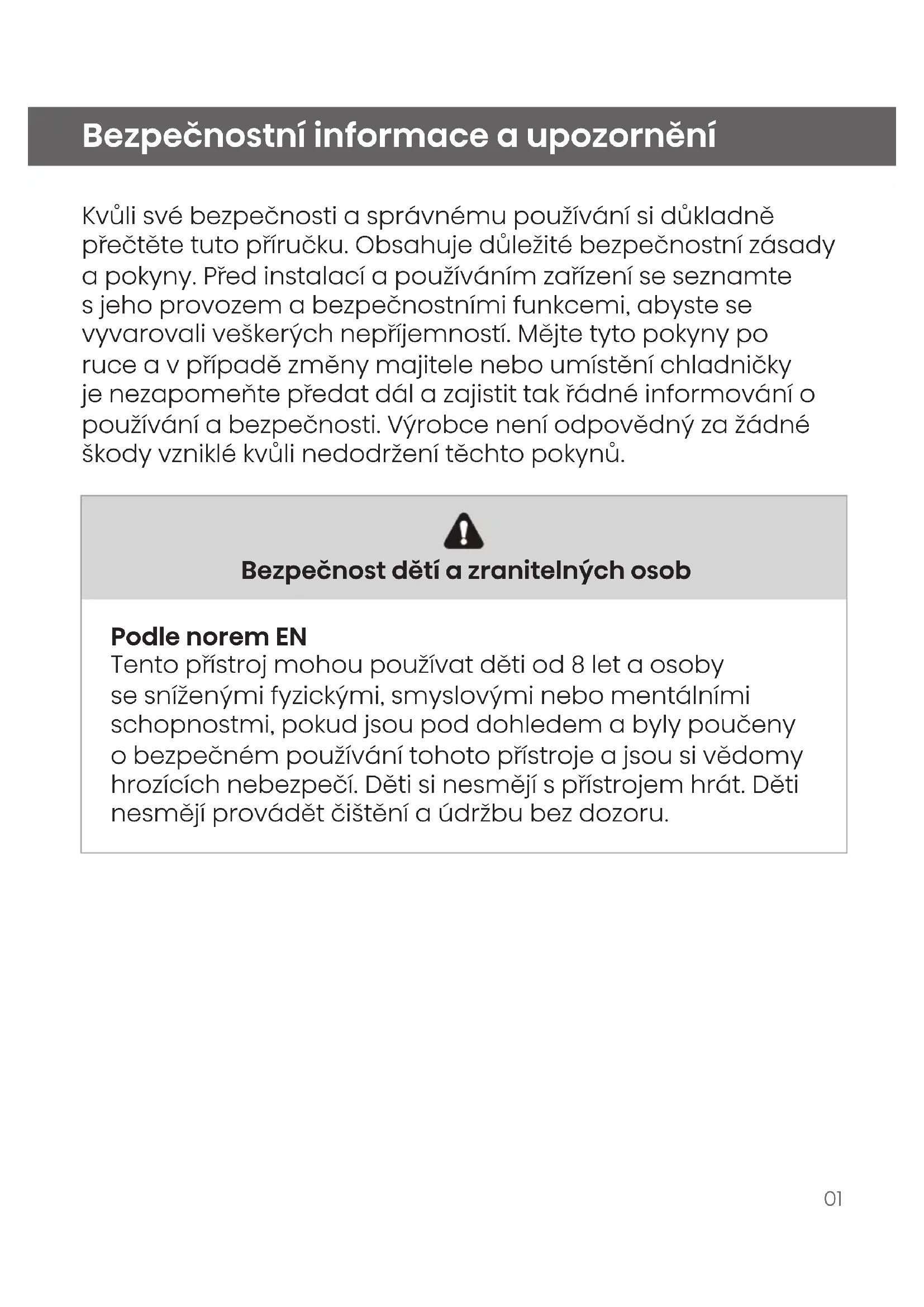 Bezpečnostní informace a upozornění Kvůli své bezpečnosti a správnému používání si důkladně přečtěte tuto příručku. Obsahuje důležité bezpečnostní zásady a pokyny. Před instalací a používáním zařízení se seznamte s jeho provozem a bezpečnostními funkcemi, abyste se vyvarovali veškerých nepříjemností. Mějte tyto pokyny po ruce a v případě změny majitele nebo umístění chladničky je nezapomeňte předat dál a zajistit tak řádné informování o používání a bezpečnosti. Výrobce není odpovědný za žádné škody vzniklé kvůli nedodržení těchto pokynů. Bezpečnost dětí a zranitelných osob Podle norem EN Tento přístroj mohou používat děti od 8 let a osoby se sníženými fyzickými, smyslovými nebo mentálními schopnostmi, pokud jsou pod dohledem a byly poučeny o bezpečném používání tohoto přístroje a jsou si vědomy hrozících nebezpečí. Děti si nesmějí s přístrojem hrát. Děti nesmějí provádět čištění a údržbu bez dozoru.02 Bezpečnost dětí a zranitelných osob Podle norem IEC Tento přístroj není určen k používání osobami (včetně dětí) se sníženými fyzickými, smyslovými nebo mentálními schopnostmi, ani osobami, které nemají odpovídající zkušenosti a znalosti, pokud nejsou pod dohledem osob zodpovědných za jejich bezpečnost nebo pokud je tyto osoby nepoučily o používání přístroje. Veškerý obalový materiál uchovávejte mimo dosah dětí, abyste předešli riziku udušení. Při likvidaci přístroje ho odpojte, odřízněte napájecí kabel blízko přístroje a odstraňte dveře, abyste předešli riziku úrazu elektrickým proudem nebo uvěznění dětí v přístroji. Při výměně staršího přístroje nezapomeňte zajistit znefunkčnění západky nebo zámku dvířek starého přístroje, aby v něm nemohlo dojít k nechtěnému uvěznění. Bezpečnostní informace a upozornění03 Obecná bezpečnost