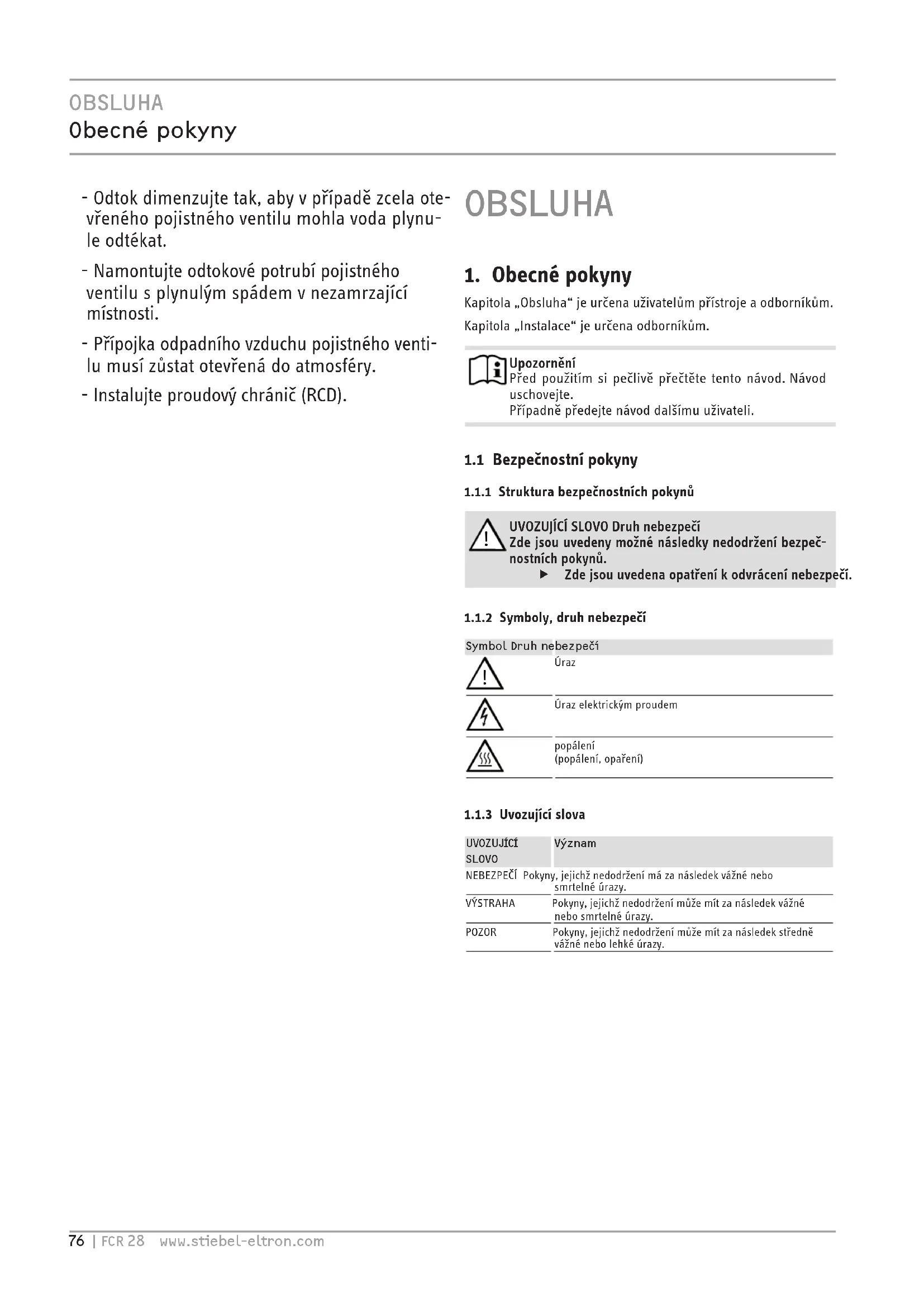 popálení(popálení, opaření) 1.1.3 Uvozující slovaUVOZUJÍCÍ SLOVOVýznamNEBEZPEČÍ Pokyny, jejichž nedodržení má za následek vážné nebo smrtelné úrazy.VÝSTRAHA Pokyny, jejichž nedodržení může mít za následek vážné nebo smrtelné úrazy.POZOR Pokyny, jejichž nedodržení může mít za následek středně vážné nebo lehké úrazy. !OBSLUHA Zabezpečení ČESKYwww.stiebel-eltron.com FCR 28 | 77