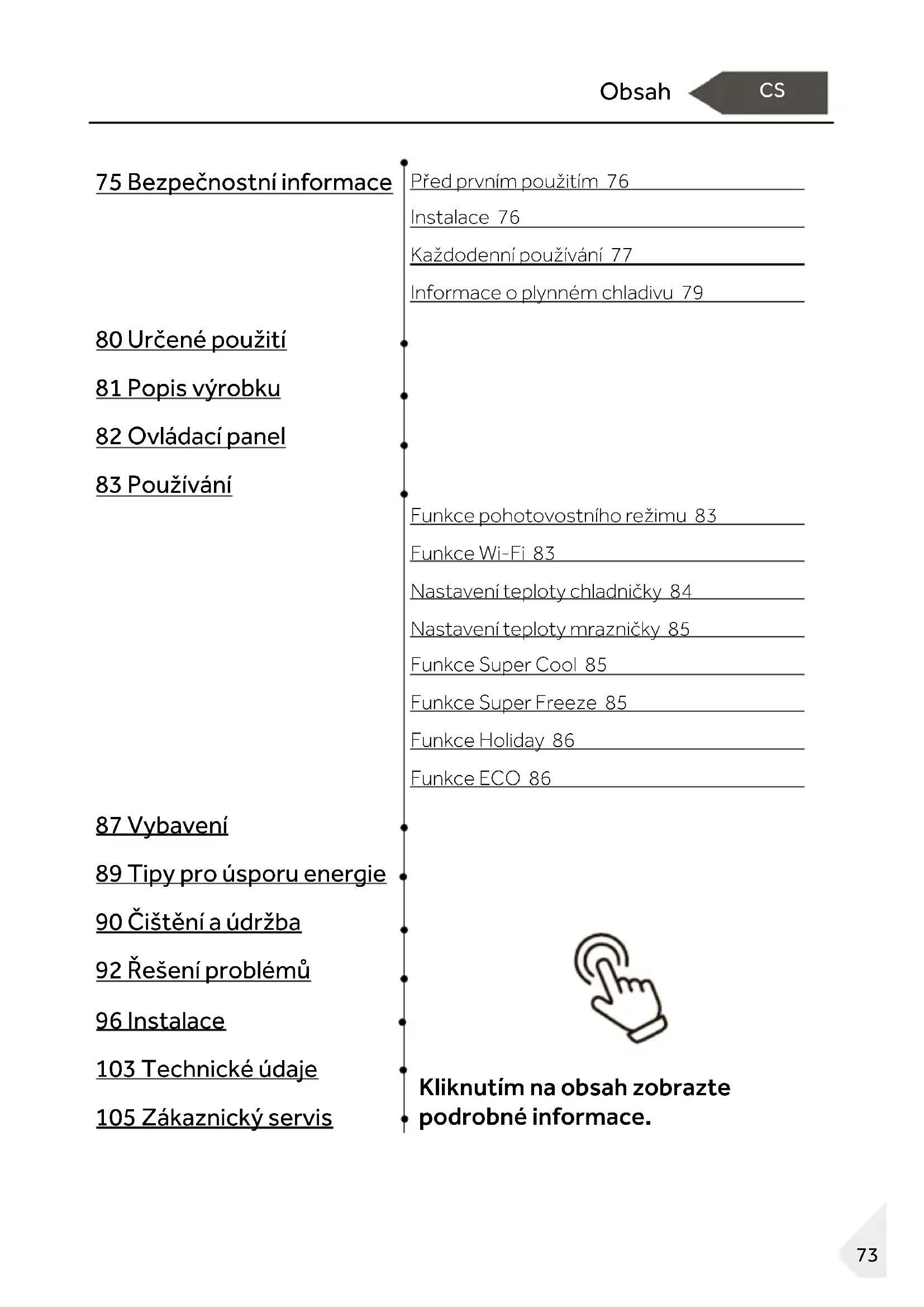 89 Tipy pro úsporu energie 90 Čištění a údržba 92 Řešení problémů 96 Instalace 103 Technické údaje Kliknutím na obsah zobrazte podrobné informace. 105 Zákaznický servisDěkujeme