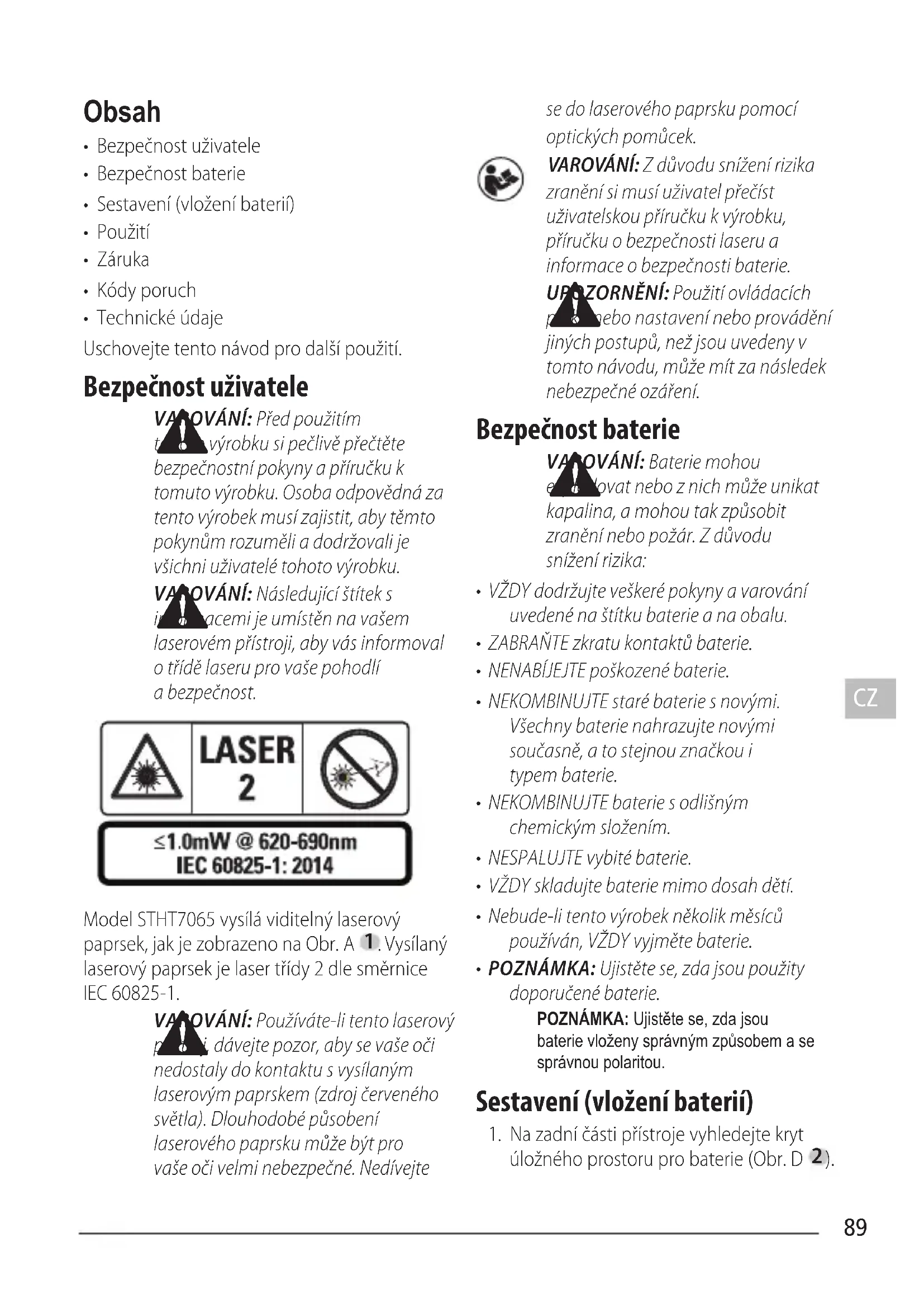 Model STHT7065 vysílá viditelný laserový paprsek, jak je zobrazeno na Obr.A . Vysílaný laserový paprsek je laser třídy 2dle směrnice IEC 60825-1. VAROVÁNÍ: Používáte‑li tento laserový přístroj, dávejte pozor, aby se vaše oči nedostaly do kontaktu s vysílaným laserovým paprskem (zdroj červeného světla). Dlouhodobé působení laserového paprsku může být pro vaše oči velmi nebezpečné. Nedívejte se do laserového paprsku pomocí optickýchpomůcek. VAROVÁNÍ: Z důvodu snížení rizika zranění si musí uživatel přečíst uživatelskou příručku k výrobku, příručku o bezpečnosti laseru a informace o bezpečnostibaterie. UPOZORNĚNÍ: Použití ovládacích prvků nebo nastavení nebo provádění jiných postupů, než jsou uvedeny v tomto návodu, může mít za následek nebezpečnéozáření. Bezpečnost baterie