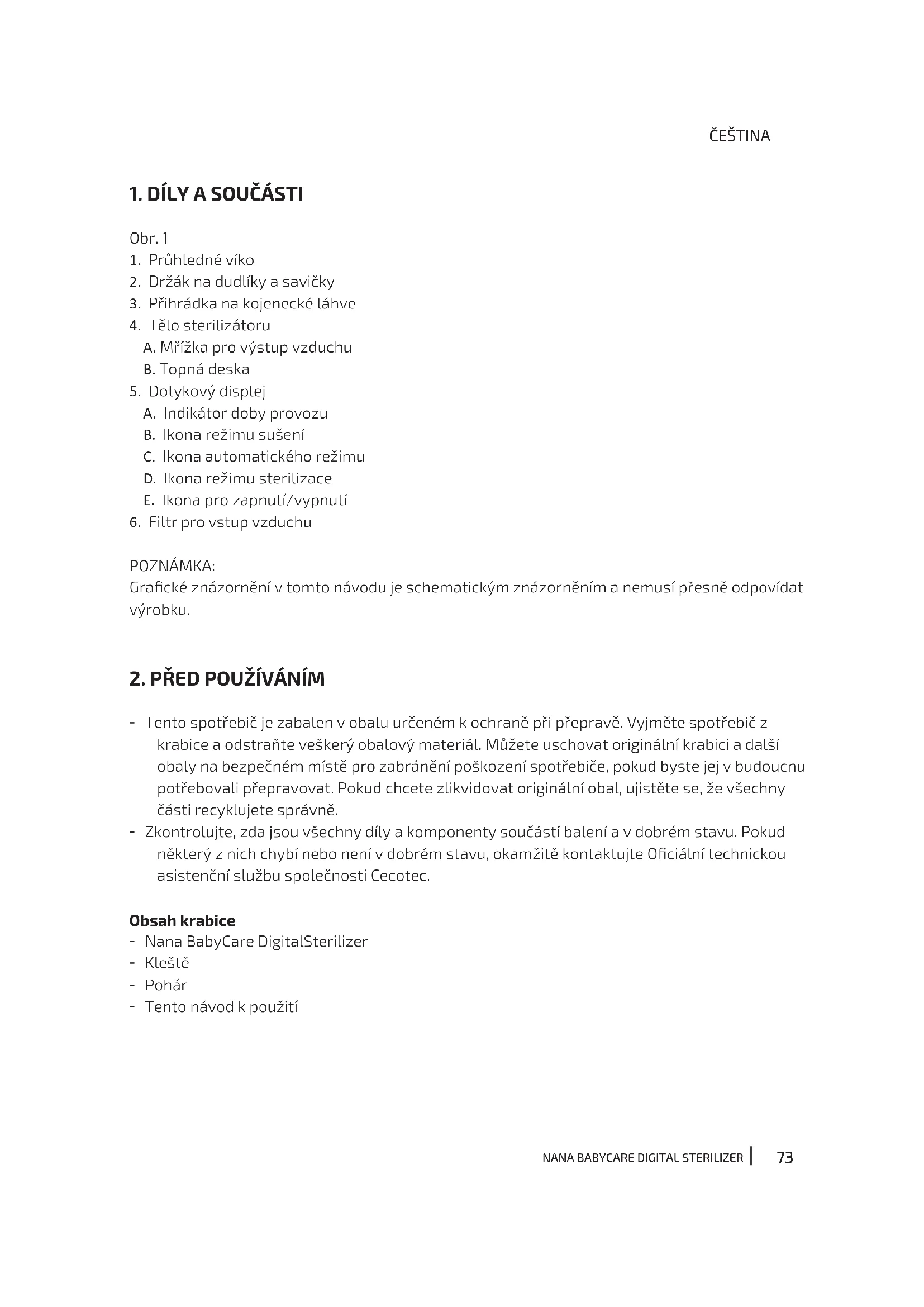 - Tento spotřebič je zabalen v obalu určeném k ochraně při přepravě. Vyjměte spotřebič z krabice a odstraňte veškerý obalový materiál. Můžete uschovat originální krabici a další obaly na bezpečném místě pro zabránění poškození spotřebiče, pokud byste jej v budoucnu potřebovali přepravovat. Pokud chcete zlikvidovat originální obal, ujistěte se, že všechny části recyklujete správně. - Zkontrolujte, zda jsou všechny díly a komponenty součástí balení a v dobrém stavu. Pokud některý z nich chybí nebo není v dobrém stavu, okamžitě kontaktujte Ociální technickou asistenční službu společnosti Cecotec. Obsah krabice - Nana BabyCare DigitalSterilizer - Kleště - Pohár - Tento návod k použitíNANA BABYCARE DIGITAL STERILIZER