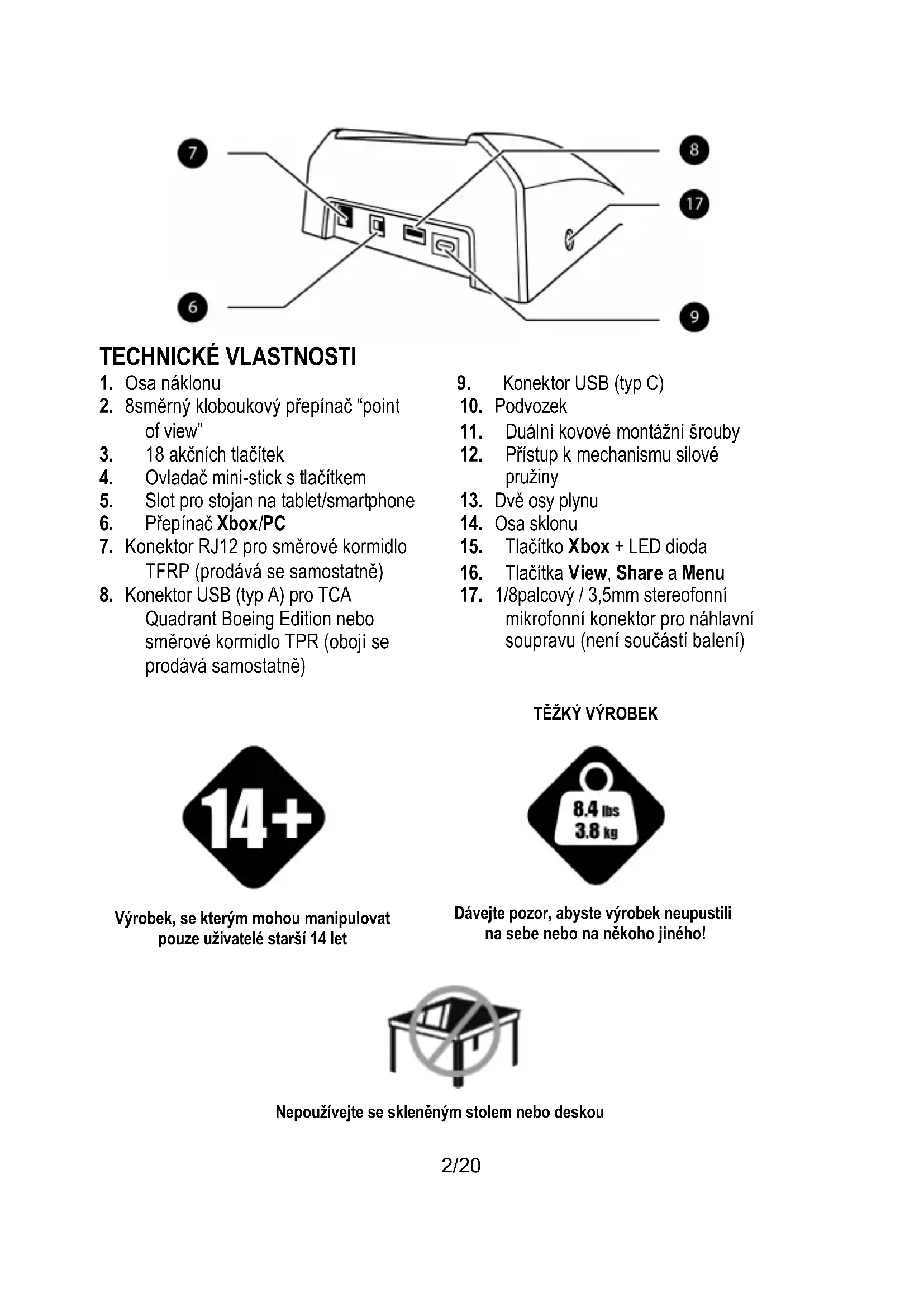 TECHNICKÁ PODPORA https://support.thrustmaster.com20/20 COPYRIGHT © 2021 Guillemot Corporation S.A. Všechna práva vyhrazena. Thrustmaster® je registrovaná ochranná známka společnosti Guillemot Corporation S.A. Vyrobeno v licenci společnosti Boeing. Boeing, 787 Dreamliner, Dreamliner s půlměsícem a související charakteristická loga Boeing, označení výrobků a obchodní značka jsou ochranné známky společnosti The Boeing Company. Windows® je registrovaná ochranná známka společnosti Microsoft Corporation ve Spojených státech a/nebo v jiných zemích. Všechny ostatní ochranné známky a obchodní značky jsou tímto uznávány a jsou majetkem příslušných vlastníků. Ilustrace nejsou závazné. Obsah, vzory a specifikace se mohou měnit bez předchozího upozornění a mohou se v jednotlivých zemích lišit. Vyrobeno v Číně. DOPORUČENÁ OCHRANA ŽIVOTNÍHO PROSTŘEDÍ V zemích Evropské unie: Na konci životnosti by tento výrobek neměl být vhozen do standardního směsného odpadu, ale odevzdán do sběrného dvoru na recyklaci elektrických a elektronických zařízení. Toto je potvrzeno symbolem, který je na výrobku, v uživatelském manuálu nebo na obalu. V závislosti na charakteristice materiálů, mohou být tyto recyklovány. Recyklací a dalšími formami zpracování odpadních elektrických a elektronických zařízení můžete významným způsobem přispět k ochraně životního prostředí. Pro informace o nebližším sběrném dvoru se obraťte na místní úřad. Pro všechny ostatní země: Dodržujte prosím místní předpisy týkající se recyklace elektrických a elektronických zařízení. Tyto informace si uchovejte. Barvy a dekorace se mohou lišit. Před použitím by měly být z výrobku odstraněny plastové spojovací lepící materiály. Tento výrobek splňuje všechny standardy týkajících se dětí ve věku 14 let a starších. Tento výrobek není vhodný pro děti mladší 14 let. www.thrustmaster.com *Platné pouze pro EU, Spojené království a Turecko