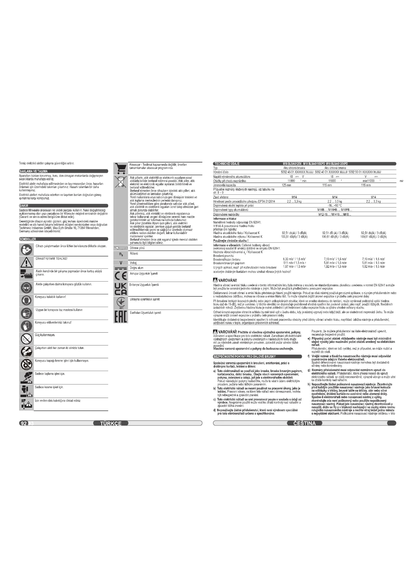 / Kolísavost K Broušení povrchů Broušení/řezání betonu Broušení brusným papírem U jiných aplikací, např. při rozbrušování nebo broušení VAROVÁNÍ! Přečtěte si všechna výstražná upozornění, pokyny, zobrazení a specifi kace pro toto elektrické nářadí. Zanedbání při dodržování výstražných upozornění a pokynů uvedených v následujícím textu může mít za následek zásah elektrickým proudem, způsobit požár a/nebo těžké poranění. Všechna varovná upozornění a pokyny do budoucna uschovejte.