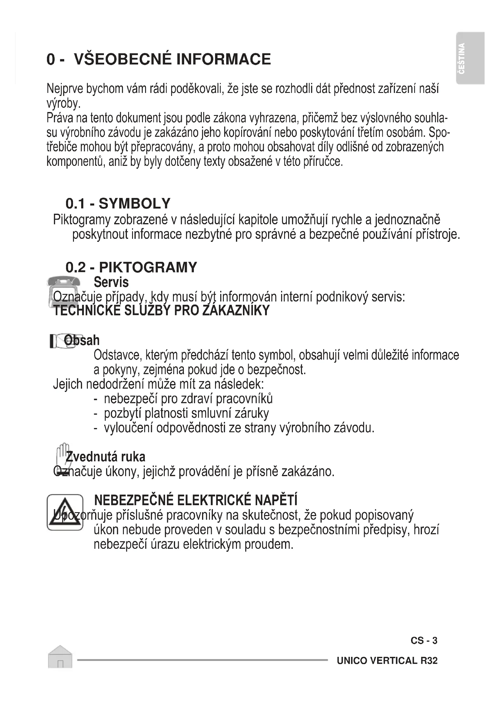 - Označuje, že informace jsou k dispozici v návodu k použití nebo návodu k instalaci. POZOR Označuje, že servisní personál musí se spotřebičem zacházet v souladu s návodem k instalaci.UNICO VERTICAL R32 CS - 5 ČEŠTINA