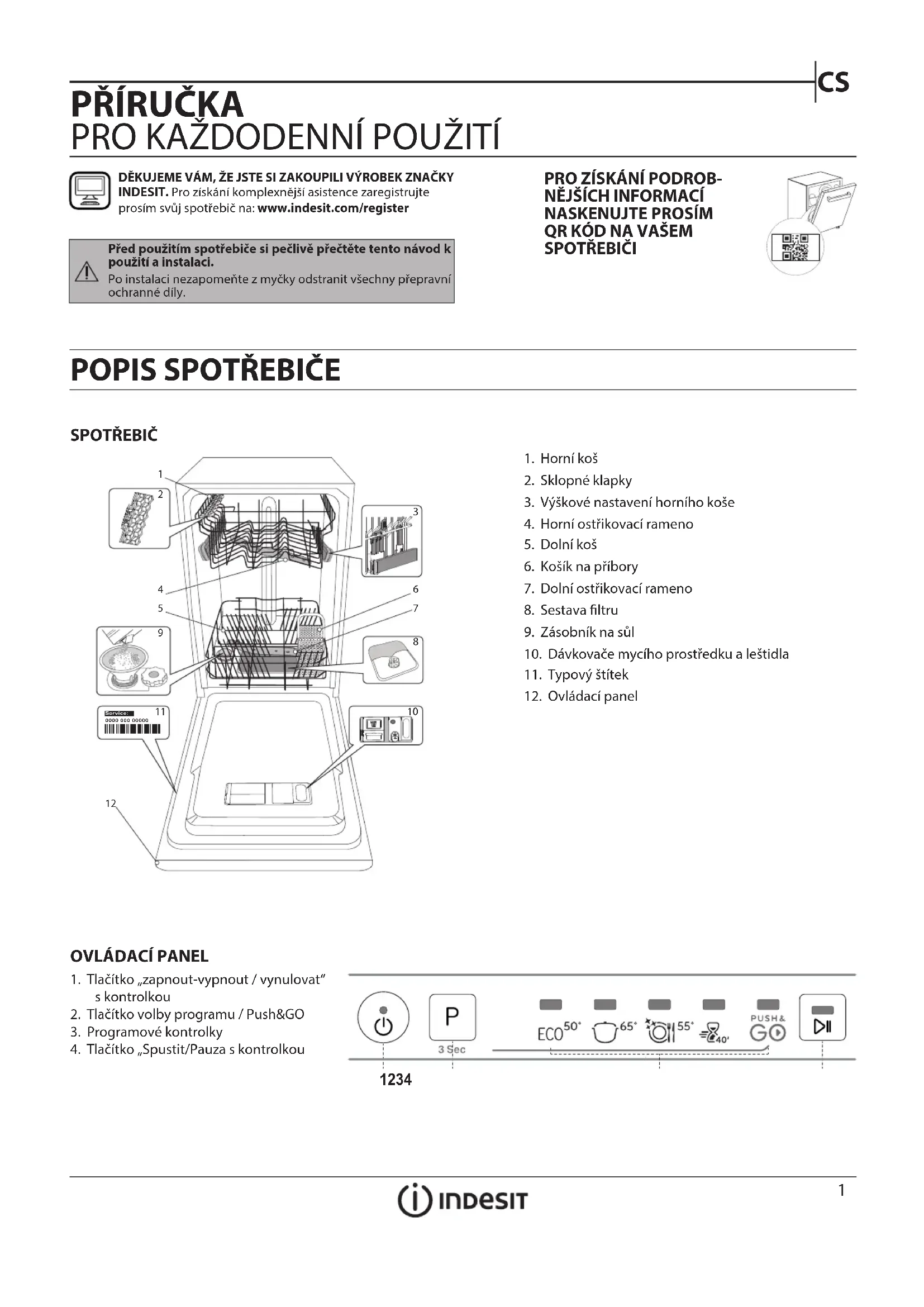 DĚKUJEME VÁM, ŽE JSTE SI ZAKOUPILI VÝROBEK ZNAČKY INDESIT. Pro získání komplexnější asistence zaregistrujte prosím svůj spotřebič na: www.indesit.com/register1. Horní koš2. Sklopné klapky3. Výškové nastavení horního koše4. Horní ostřikovací rameno5. Dolní koš6. Košík na příbory7. Dolní ostřikovací rameno8. Sestava ltru9. Zásobník na sůl10. Dávkovače mycího prostředku a leštidla11. Typový štítek12. Ovládací panel1. Tlačítko „zapnout-vypnout / vynulovat“ s kontrolkou2. Tlačítko volby programu / Push&GO3. Programové kontrolky4. Tlačítko „Spustit/Pauza s kontrolkou