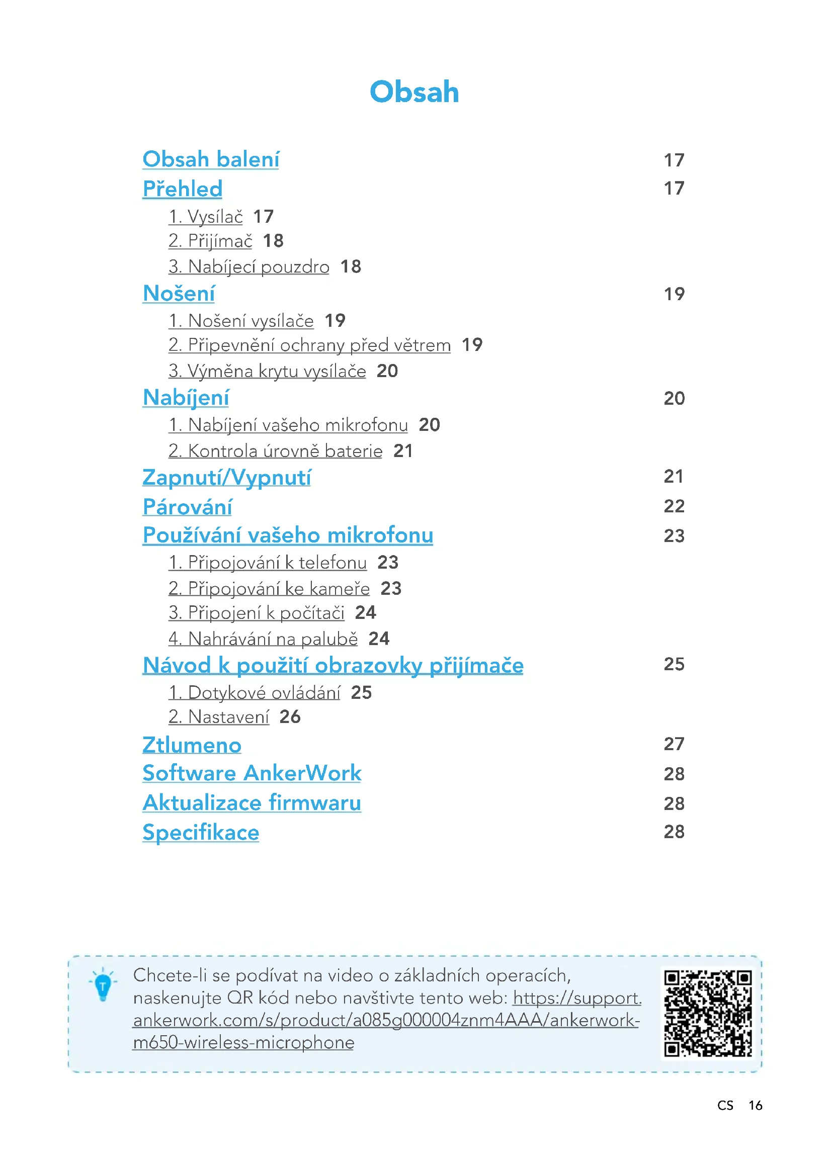 Když je úložný prostor plný, můžete odstranit zvukové soubory nebo zapnout „Přepsat soubory“ v softwaru AnkerWork. Návod kpoužití obrazovky přijímače Chcete-li sledovat video návodu k použití obrazovky přijímače, naskenujte QR kód nebo navštivte tento web: https://support. ankerwork.com/s/product/a085g000004znm4AAA/ankerwork- m650-wireless-microphone