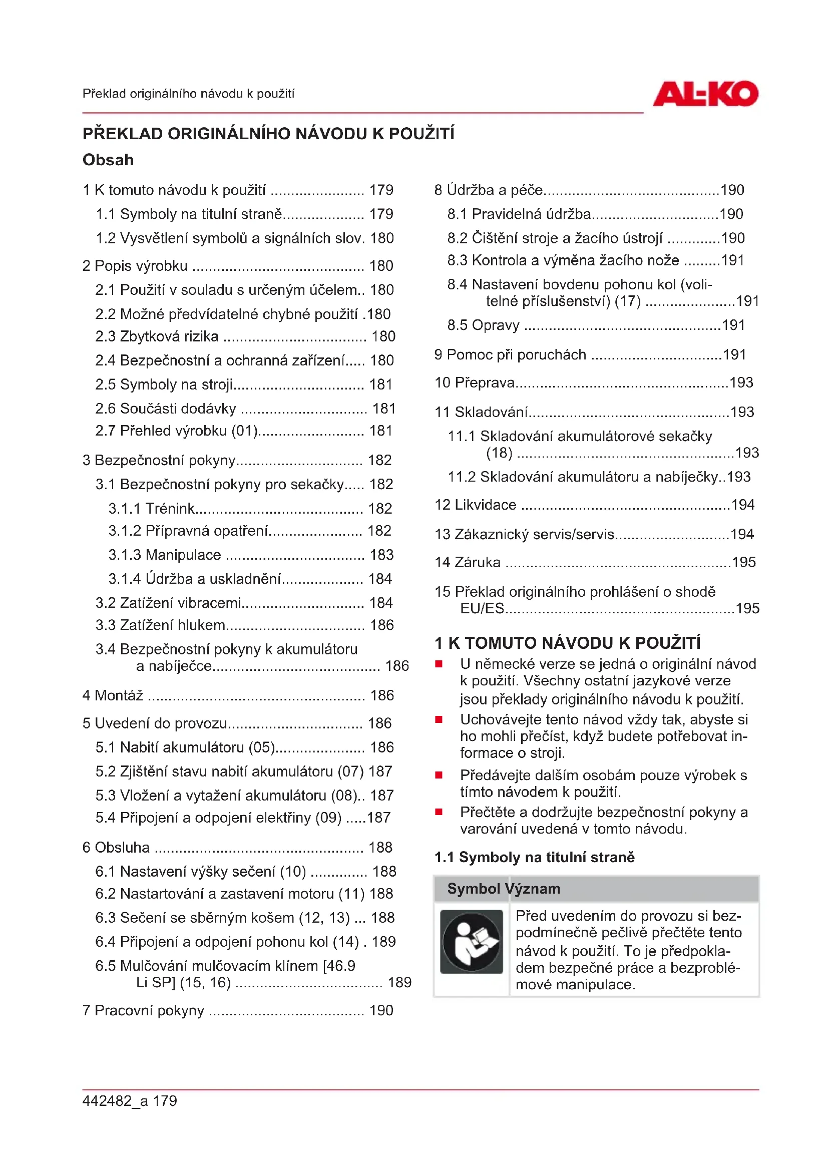 94,2dB(A) / 96dB(A)442482_a 179 Překlad originálního návodu kpoužití PŘEKLAD ORIGINÁLNÍHO NÁVODU KPOUŽITÍ Obsah 1 K tomuto návodu k použití ....................... 179