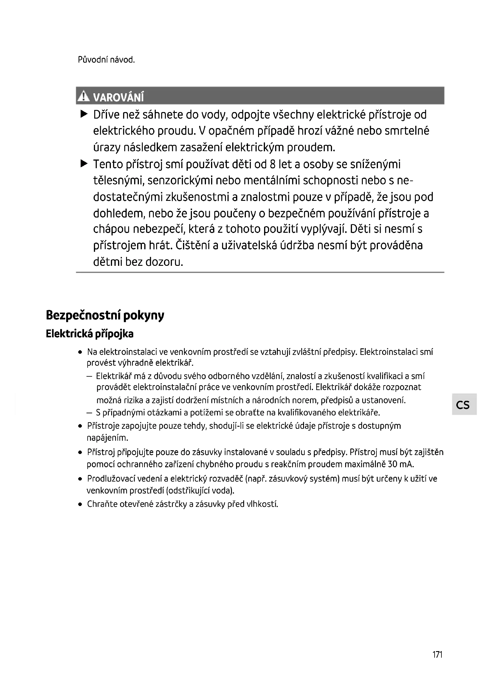VAROV ÁNÍ VAROVÁNÍ Dříve než sáhnete do vody, odpojte všechny elektrické přístroje od elektrického proudu. V opačném případě hrozí vážné nebo smrtelné úrazy následkem zasažení elektrickým proudem. Tento přístroj smí používat děti od 8 let a osoby se sníženými tělesnými, senzorickými nebo mentálními schopnosti nebo s ne- dostatečnými zkušenostmi a znalostmi pouze v případě, že jsou pod dohledem, nebo že jsou poučeny o bezpečném používání přístroje a chápou nebezpečí, která z tohoto použití vyplývají. Děti si nesmí s přístrojem hrát. Čištění a uživatelská údržba nesmí být prováděna dětmi bez dozoru.