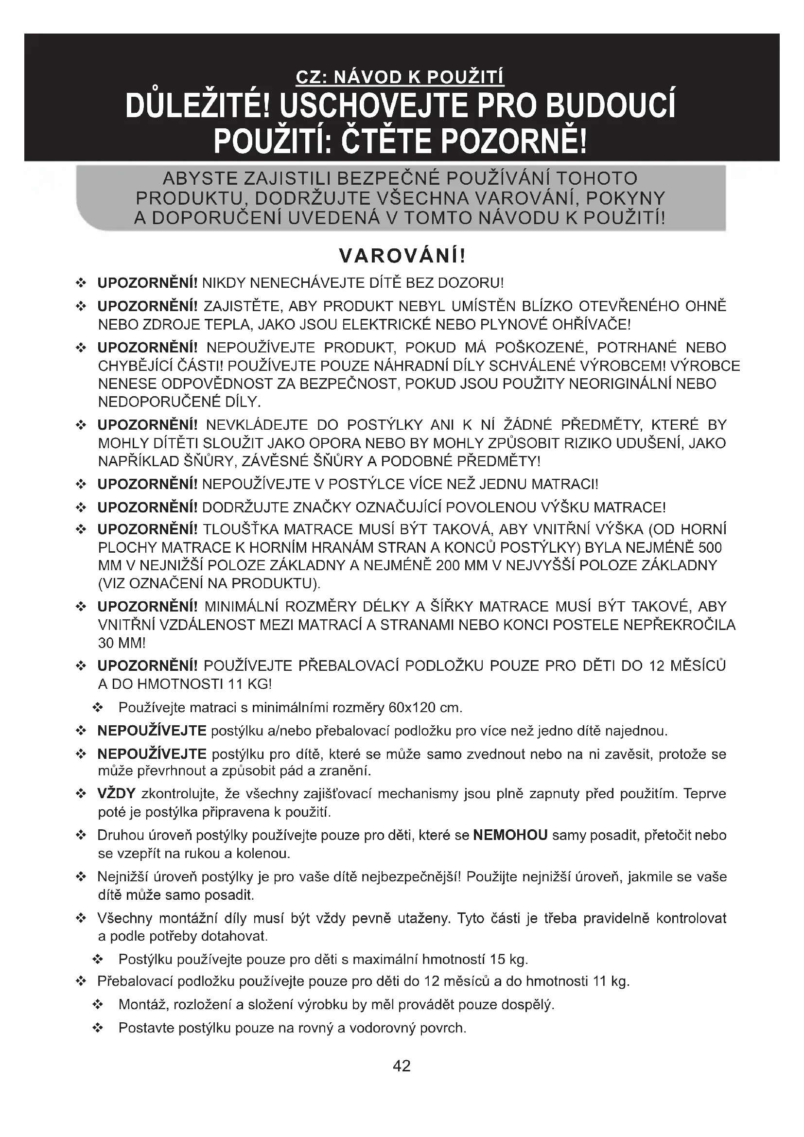 VžDY zkontrolujte, ze všechny zajistovací mechanismy jsou plné zapnuty préd použitím. Teprve poté je postýlka priapravena k použiti.