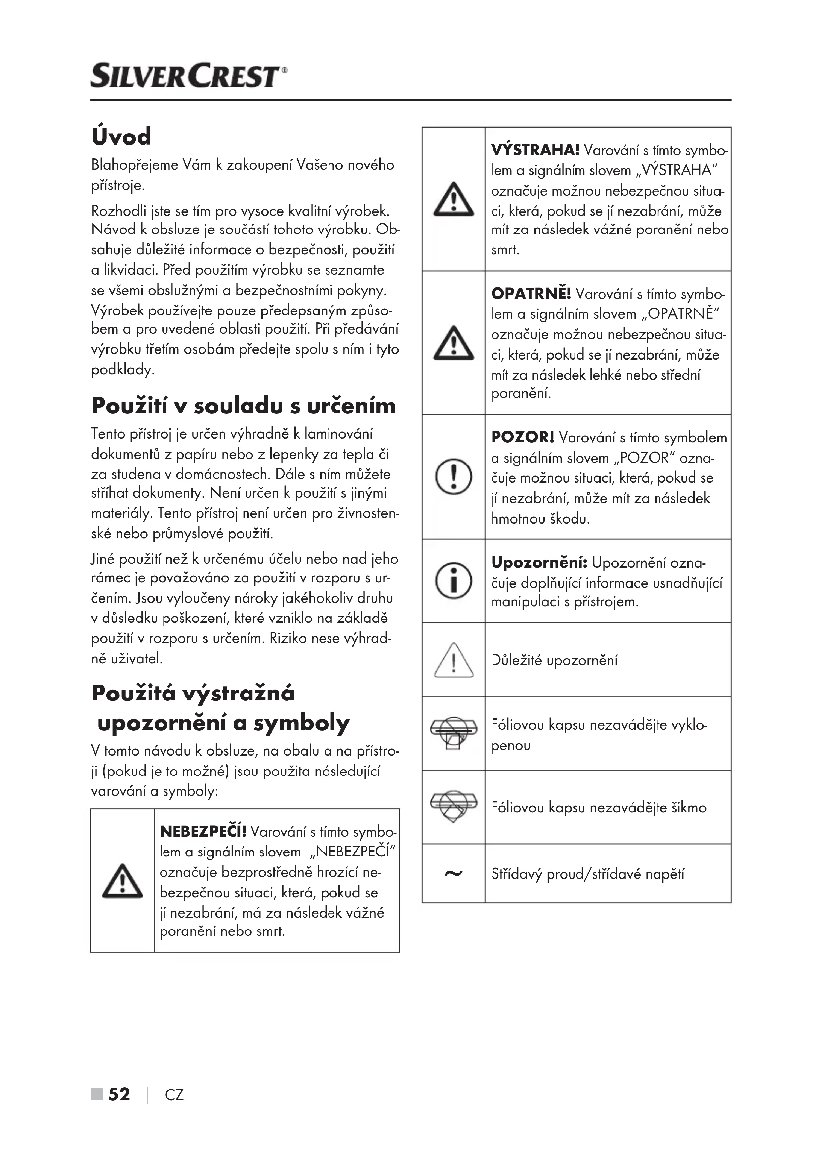 CZ Úvod Blahopřejeme Vám kzakoupení Vašeho nového přístroje. Rozhodli jste se tím pro vysoce kvalitní výrobek. Návod kobsluze je součástí tohoto výrobku. Ob- sahuje důležité informace obezpečnosti, použití a likvidaci. Před použitím výrobku se seznamte se všemi obslužnými a bezpečnostními pokyny. Výrobek používejte pouze předepsaným způso- bem a pro uvedené oblasti použití. Při předávání výrobku třetím osobám předejte spolu sním ityto podklady. Použití vsouladu surčením Tento přístroj je určen výhradně klaminování dokumentů zpapíru nebo zlepenky za tepla či za studena vdomácnostech. Dále sním můžete stříhat dokumenty. Není určen kpoužití sjinými materiály. Tento přístroj není určen pro živnosten- ské nebo průmyslové použití. Jiné použití než kurčenému účelu nebo nad jeho rámec je považováno za použití vrozporu sur- čením. Jsou vyloučeny nároky jakéhokoliv druhu v důsledku poškození, které vzniklo na základě použití vrozporu surčením. Riziko nese výhrad- ně uživatel. Použitá výstražná upozornění a symboly V tomto návodu k obsluze, na obalu a na přístro- ji (pokud je to možné) jsou použita následující varování a symboly: NEBEZPEČÍ! Varování s tímto symbo- lem a signálním slovem „NEBEZPEČÍ“ označuje bezprostředně hrozící ne- bezpečnou situaci, která, pokud se jí nezabrání, má za následek vážné poranění nebo smrt. VÝSTRAHA! Varování s tímto symbo- lem a signálním slovem „VÝSTRAHA“ označuje možnou nebezpečnou situa- ci, která, pokud se jí nezabrání, může mít za následek vážné poranění nebo smrt. OPATRNĚ! Varování s tímto symbo- lem a signálním slovem „OPATRNĚ“ označuje možnou nebezpečnou situa- ci, která, pokud se jí nezabrání, může mít za následek lehké nebo střední poranění. POZOR! Varování s tímto symbolem a signálním slovem „POZOR“ ozna- čuje možnou situaci, která, pokud se jí nezabrání, může mít za následek hmotnou škodu. Upozornění: Upozornění ozna- čuje doplňující informace usnadňující manipulaci s přístrojem. Důležité upozornění Fóliovou kapsu nezavádějte vyklo- penou Fóliovou kapsu nezavádějte šikmo