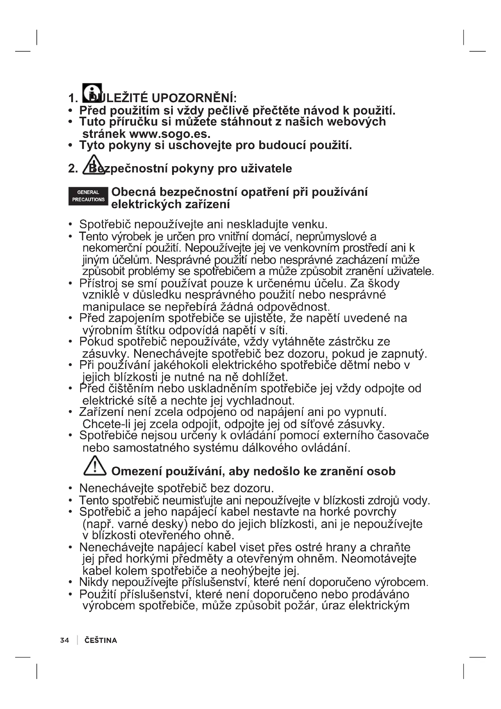 GENERAL PRECAUTIONS Obecná bezpečnostní opatření při používání elektrických zařízení