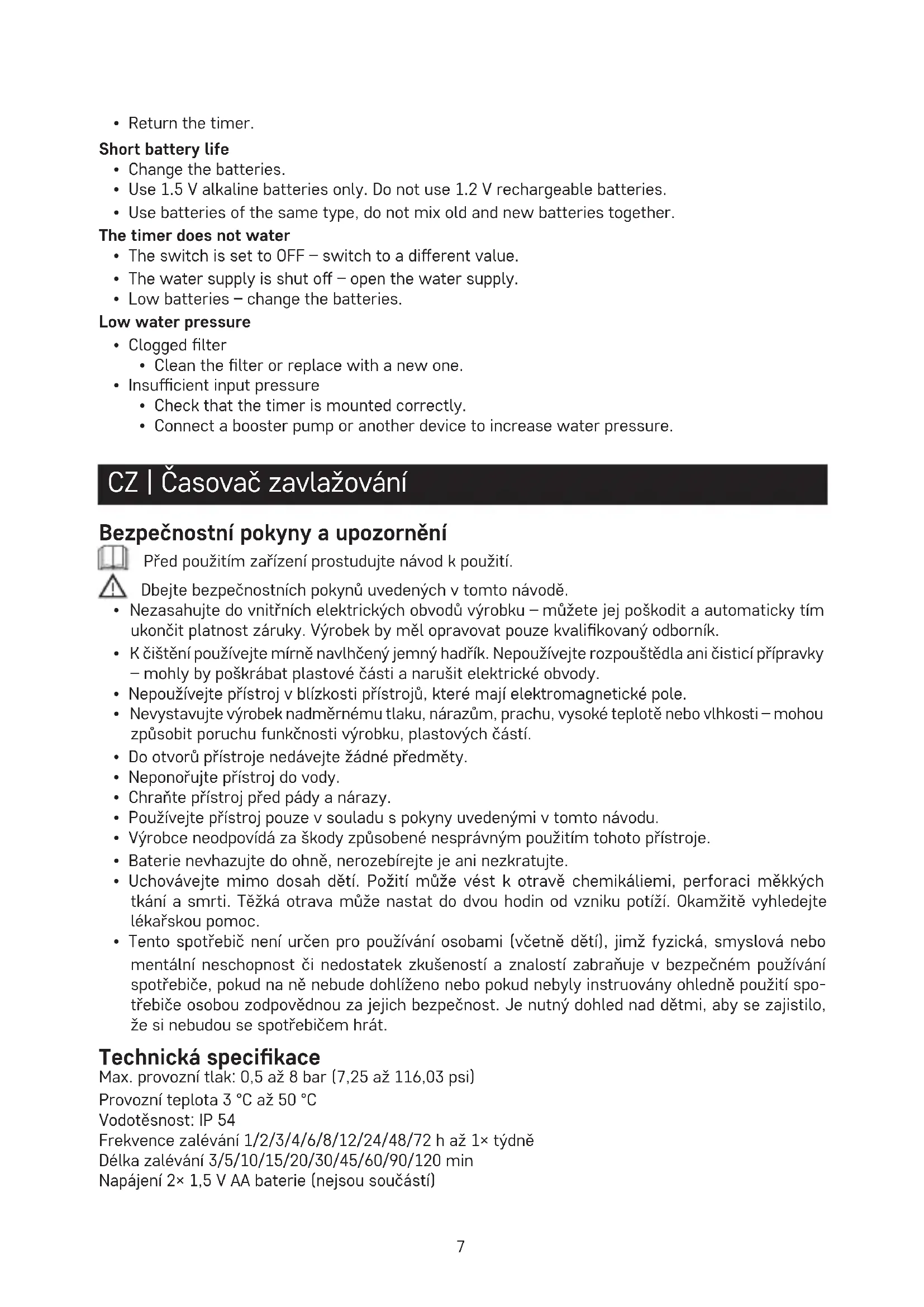 - Connect a booster pump or another device to increase water pressure. CZ | Časovač zavlažování Bezpečnostní pokyny a upozornění Před použitím zařízení prostudujte návod kpoužití. Dbejte bezpečnostních pokynů uvedených vtomto návodě.