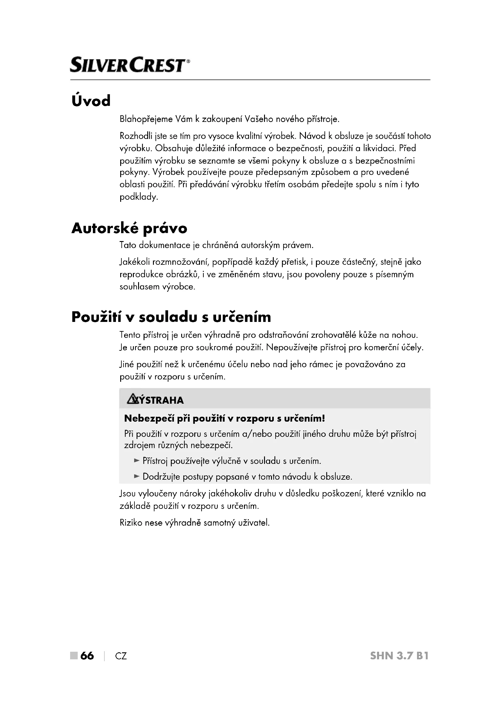 CZ SHN 3.7 B1 Úvod Blahopřejeme Vám kzakoupení Vašeho nového přístroje. Rozhodli jste se tím pro vysoce kvalitní výrobek. Návod kobsluze je součástí tohoto výrobku. Obsahuje důležité informace obezpečnosti, použití a likvidaci. Před použitím výrobku se seznamte se všemi pokyny k obsluze a s bezpečnostními pokyny. Výrobek používejte pouze předepsaným způsobem a pro uvedené oblasti použití. Při předávání výrobku třetím osobám předejte spolu sním ityto podklady. Autorské právo Tato dokumentace je chráněná autorským právem. Jakékoli rozmnožování, popřípadě každý přetisk, ipouze částečný, stejně jako reprodukce obrázků, ive změněném stavu, jsou povoleny pouze spísemným souhlasem výrobce. Použití vsouladu surčením Tento přístroj je určen výhradně pro odstraňování zrohovatělé kůže na nohou. Je určen pouze pro soukromé použití. Nepoužívejte přístroj pro komerční účely. Jiné použití než kurčenému účelu nebo nad jeho rámec je považováno za použití vrozporu surčením. VÝSTRAHA Nebezpečí při použití vrozporu surčením! Při použití vrozporu surčením a/nebo použití jiného druhu může být přístroj zdrojem různých nebezpečí. ► Přístroj používejte výlučně vsouladu surčením. ► Dodržujte postupy popsané vtomto návodu kobsluze. Jsou vyloučeny nároky jakéhokoliv druhu v důsledku poškození, které vzniklo na základě použití vrozporu surčením. Riziko nese výhradně samotný uživatel.CZ