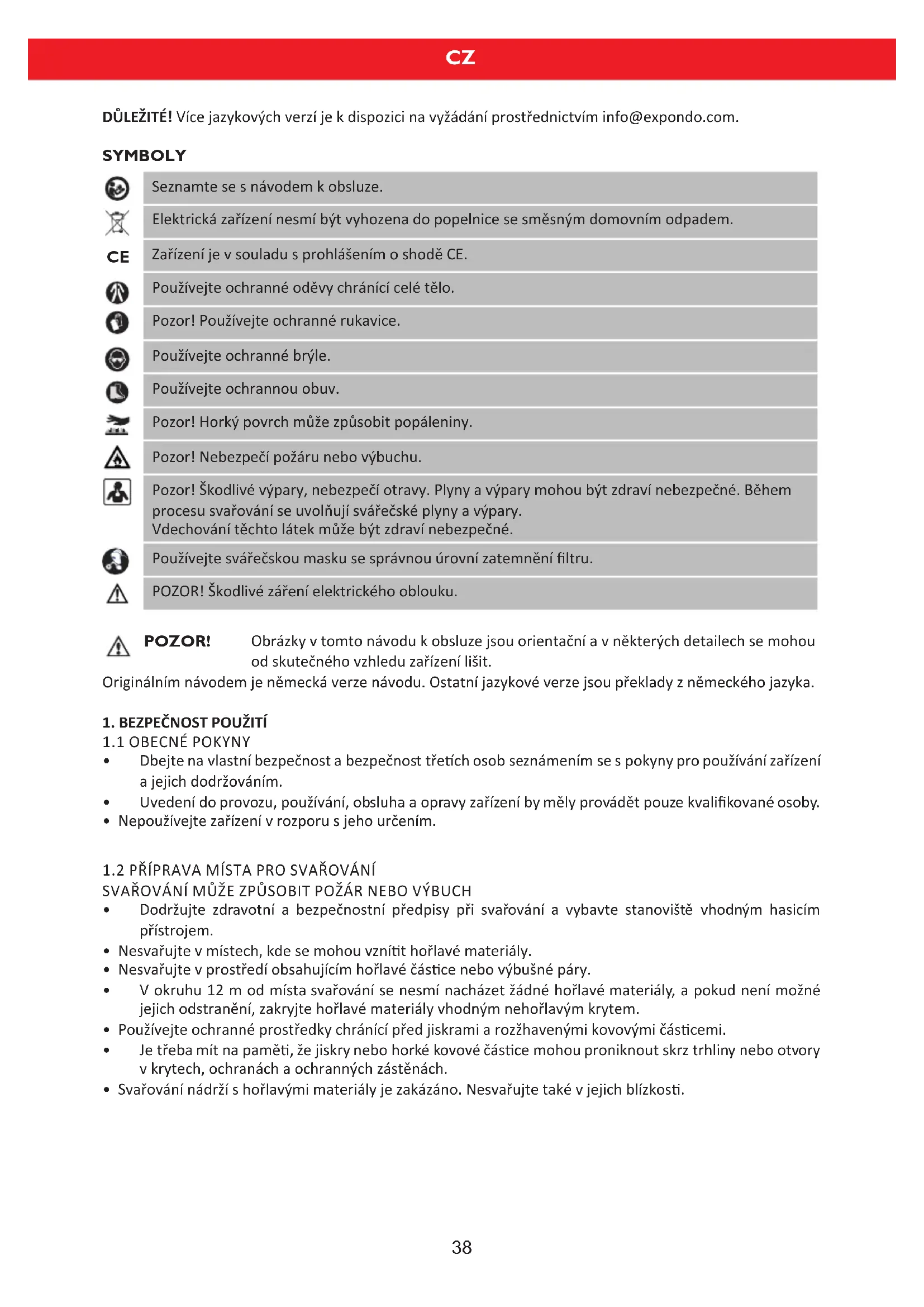 - Svařování nádrží s hořlavými materiály je zakázáno. Nesvařujte také v jejich blízkos. DŮLEŽITÉ! Více jazykových verzí je k dispozici na vyžádání prostřednictvím info@expondo.com.39 Rev. 03.01.2018