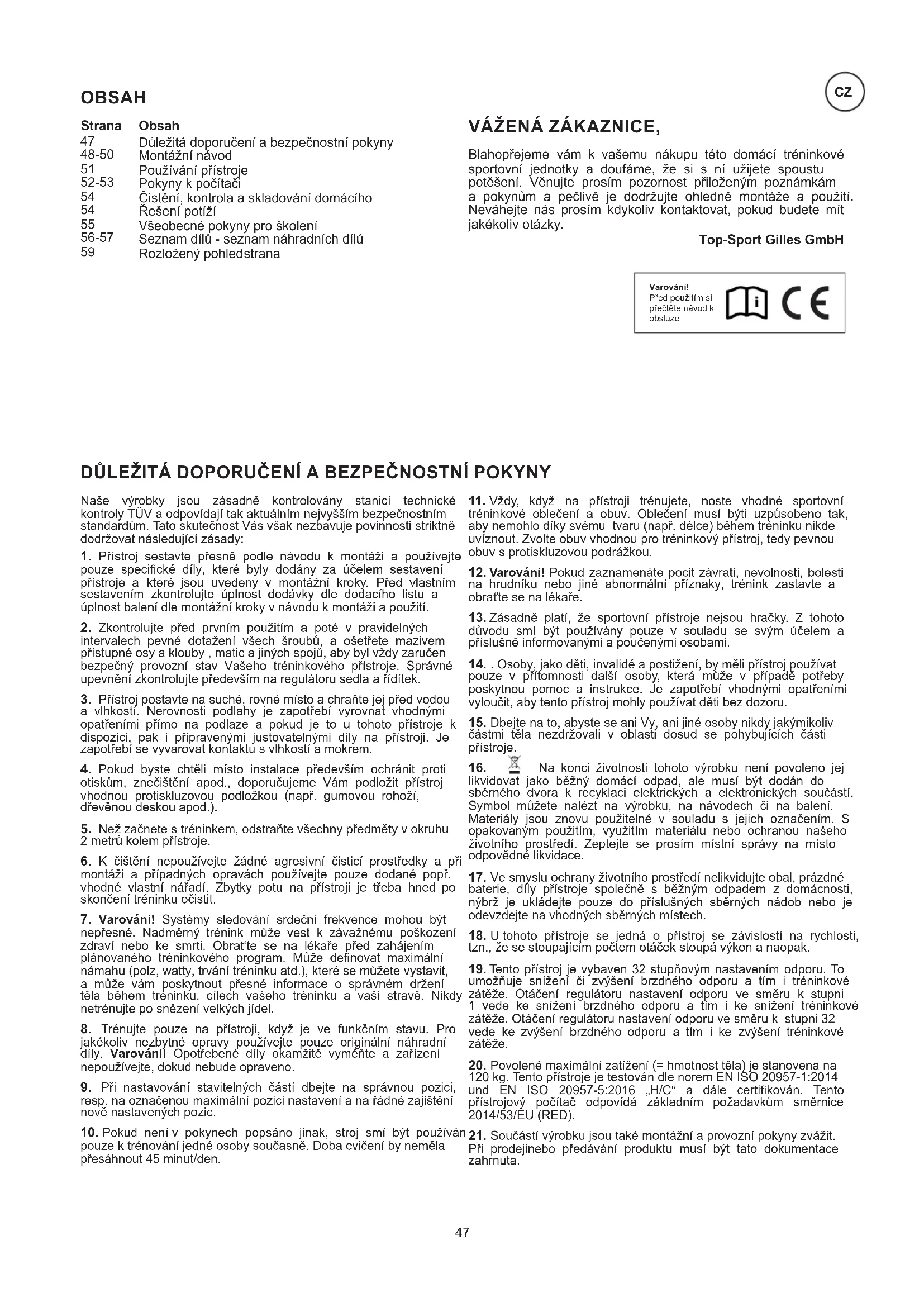 Při prodejinebo předávání produktu musí být tato dokumentace zahrnuta. DŮLEŽITÁ DOPORUČENÍ A BEZPEČNOSTNÍ POKYNY Naše výrobky jsou zásadně kontrolovány stanicí technické kontroly TÜV a odpovídají tak aktuálním nejvyšším bezpečnostním standardům. Tato skutečnost Vás však nezbavuje povinnosti striktně dodržovat následující zásady: OBSAH VÁŽENÁ ZÁKAZNICE, Blahopřejeme vám k vašemu nákupu této domácí tréninkové sportovní jednotky a doufáme, že si s ní užijete spoustu potěšení. Věnujte prosím pozornost přiloženým poznámkám a pokynům a pečlivě je dodržujte ohledně montáže a použití. Neváhejte nás prosím kdykoliv kontaktovat, pokud budete mít jakékoliv otázky. Top-Sport Gilles GmbH ObsahStrana Varování! Před použitím si přečtěte návod k obsluze
