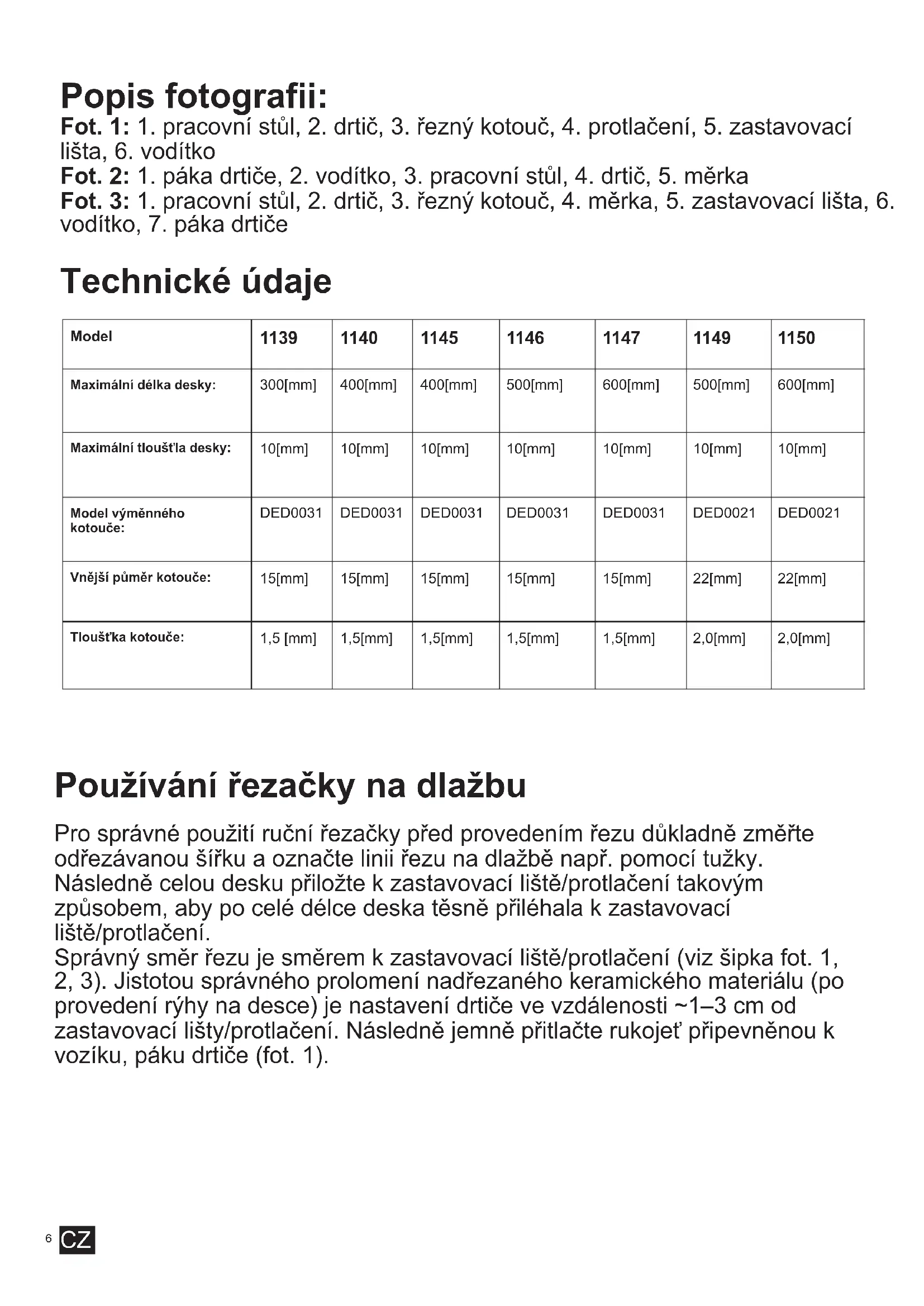 Datum provedení opravy Podpis opraváře Rozsah opravy , popis úkonů CZ9 Opis fotografií: Fot. 1:1. pracovný stôl, 2. lámač, 3. rezacie koliesko, 4. profilovanie, 5. oporná lišta, 6. vodidlo Fot. 2: 1. páka lámača, 2. vodidlo, 3. pracovný stôl, 4. lámač, 5. mierka Fot. 3: 1. pracovný stôl, 2. lámač, 3. rezacie koliesko, 4. mierka, 5. oporná lišta, 6. vodidlo, 7. páka lámača Technické parametre Model