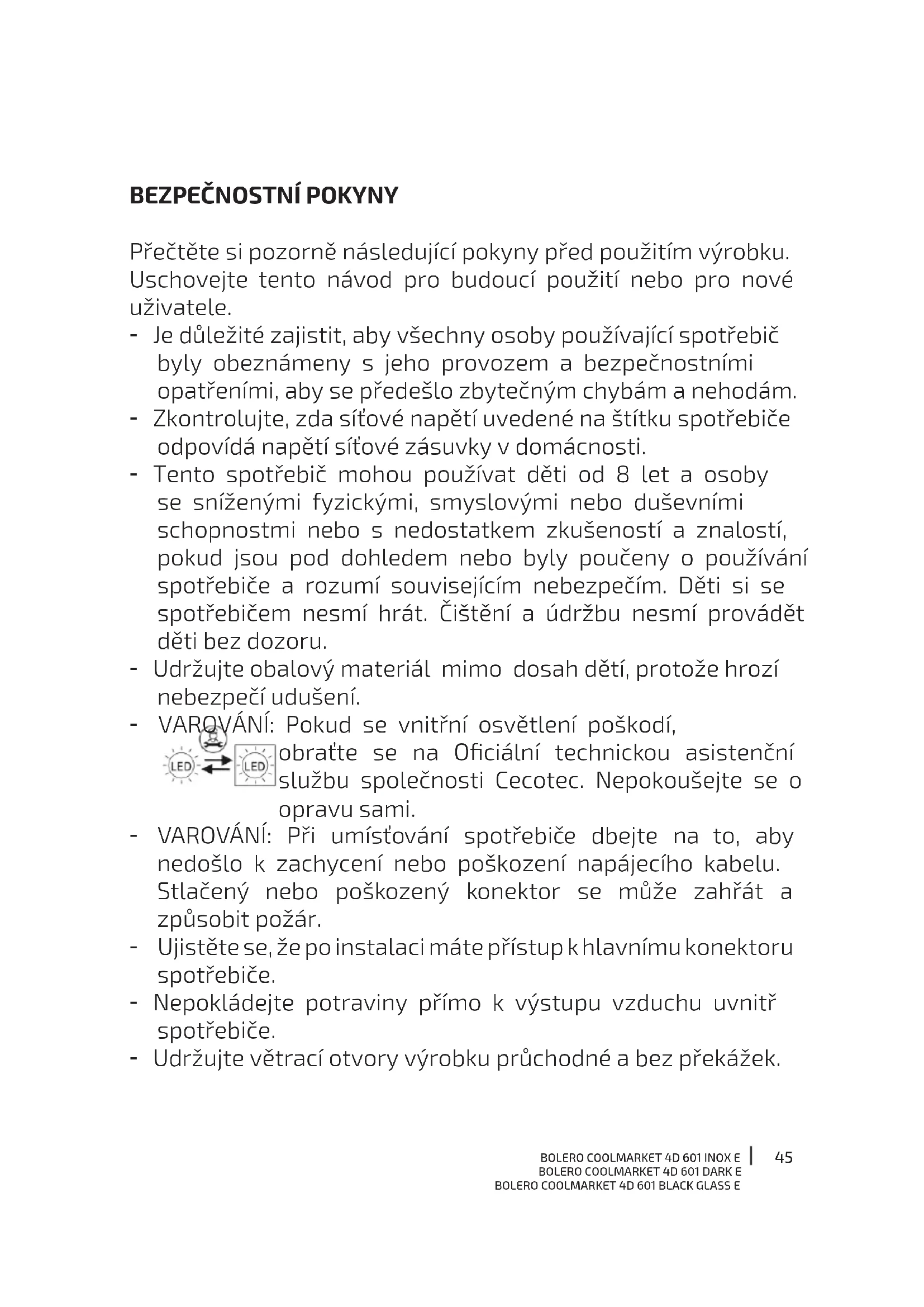 Přečtěte si pozorně následující pokyny před použitím výrobku. Uschovejte tento návod pro budoucí použití nebo pro nové uživatele. - Je důležité zajistit, aby všechny osoby používající spotřebič byly obeznámeny s jeho provozem a bezpečnostními opatřeními, aby se předešlo zbytečným chybám a nehodám. - Zkontrolujte, zda síťové napětí uvedené na štítku spotřebiče odpovídá napětí síťové zásuvky v domácnosti. - Tento spotřebič mohou používat děti od 8 let a osoby se sníženými fyzickými, smyslovými nebo duševními schopnostmi nebo s nedostatkem zkušeností a znalostí, pokud jsou pod dohledem nebo byly poučeny o používání spotřebiče a rozumí souvisejícím nebezpečím. Děti si se spotřebičem nesmí hrát. Čištění a údržbu nesmí provádět děti bez dozoru. - Udržujte obalový materiál mimo dosah dětí, protože hrozí nebezpečí udušení. - VAROVÁNÍ: Pokud se vnitřní osvětlení poškodí, obraťte se na Ociální technickou asistenční službu společnosti Cecotec. Nepokoušejte se o opravu sami. - VAROVÁNÍ: Při umísťování spotřebiče dbejte na to, aby nedošlo k zachycení nebo poškození napájecího kabelu. Stlačený nebo poškozený konektor se může zahřát a způsobit požár. - Ujistěte se, že po instalaci máte přístup k hlavnímu konektoru spotřebiče. - Nepokládejte potraviny přímo k výstupu vzduchu uvnitř spotřebiče. - Udržujte větrací otvory výrobku průchodné a bez překážek.46