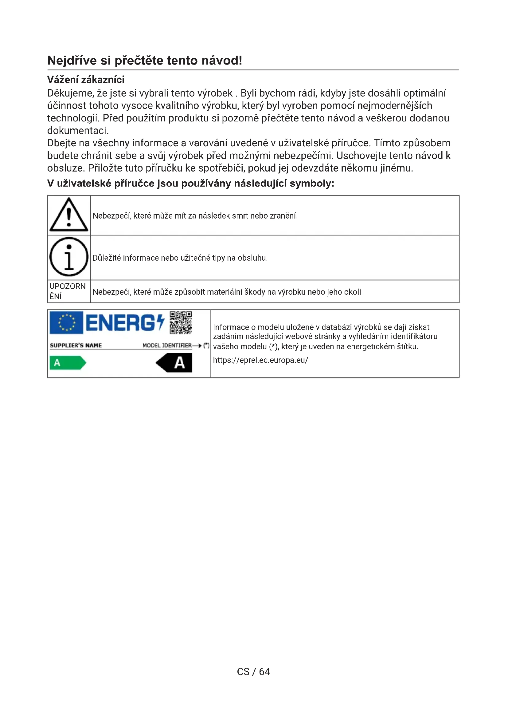 SKCS / 64 Nejdříve si přečtěte tento návod! Vážení zákazníci Děkujeme, že jste si vybrali tento výrobek . Byli bychom rádi, kdyby jste dosáhli optimální účinnost tohoto vysoce kvalitního výrobku, který byl vyroben pomocí nejmodernějších technologií. Před použitím produktu si pozorně přečtěte tento návod a veškerou dodanou dokumentaci. Dbejte na všechny informace a varování uvedené v uživatelské příručce. Tímto způsobem budete chránit sebe a svůj výrobek před možnými nebezpečími. Uschovejte tento návod k obsluze. Přiložte tuto příručku ke spotřebiči, pokud jej odevzdáte někomu jinému. V uživatelské příručce jsou používány následující symboly: Nebezpečí, které může mít za následek smrt nebo zranění. Důležité informace nebo užitečné tipy na obsluhu. UPOZORN ĚNÍ Nebezpečí, které může způsobit materiální škody na výrobku nebo jeho okolí Informace o modelu uložené v databázi výrobků se dají získat zadáním následující webové stránky a vyhledáním identifikátoru vašeho modelu (*), který je uveden na energetickém štítku. https://eprel.ec.europa.eu/CS / 65 1 Bezpečnostní pokyny