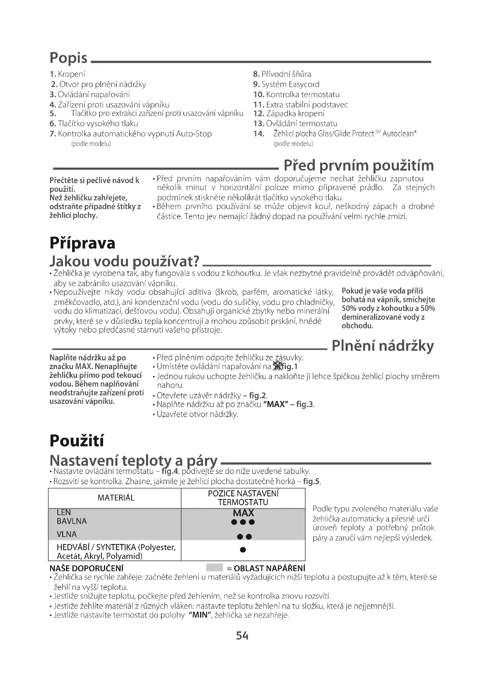 - Nastavte teplotu podle materiálu, který budete žehlit.• Umístěte ovládání napařování na – fig.1.• Jakmile kontrolka zhasne, můžete začít žehlit. Přídavné funkce Žehlicí plocha Gliss/Glide Protect