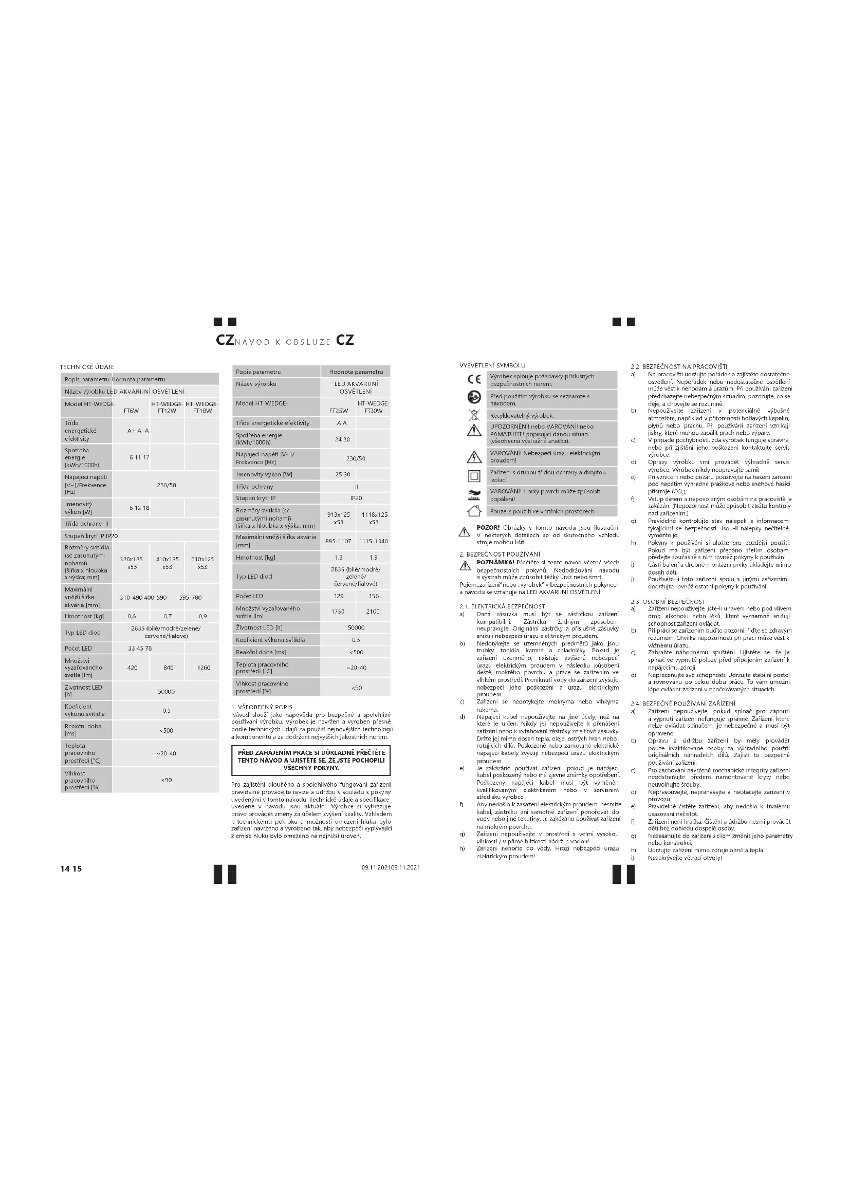 Koecient výkonu svítidla 0,5 Reakční doba [ms] <500 Teplota pracovního prostředí [°C] ~20-40 Vlhkost pracovního prostředí [%] <90 Popis parametru Hodnota parametru Název výrobku LED AKVARIJNÍ OSVĚTLENÍ Model HT-WEDGE- FT25W HT-WEDGE- FT30W Třída energetické efektivity A A Spotřeba energie [kWh/1000h)