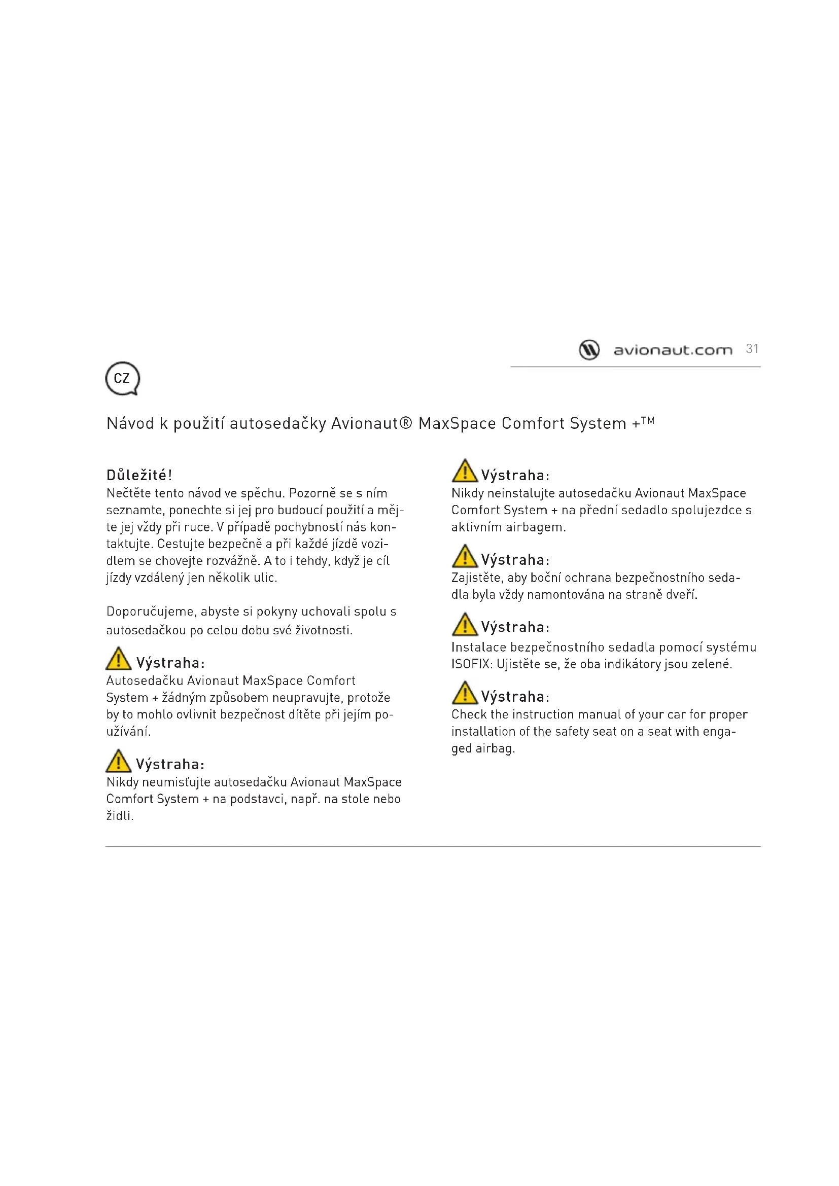 30Důležité! Nečtěte tento návod ve spěchu. Pozorně se s ním seznamte, ponechte si jej pro budoucí použití a měj- te jej vždy při ruce. V případě pochybností nás kon- taktujte. Cestujte bezpečně a při každé jízdě vozi- dlem se chovejte rozvážně. A to i tehdy, když je cíl jízdy vzdálený jen několik ulic. Doporučujeme, abyste si pokyny uchovali spolu s autosedačkou po celou dobu své životnosti. Výstraha: Autosedačku Avionaut MaxSpace Comfort System + žádným způsobem neupravujte, protože by to mohlo ovlivnit bezpečnost dítěte při jejím po- užívání. Výstraha: Nikdy neumisťujte autosedačku Avionaut MaxSpace Comfort System + na podstavci, např. na stole nebo židli. Návod k použití autosedačky Avionaut® MaxSpace Comfort System +™ Výstraha: Nikdy neinstalujte autosedačku Avionaut MaxSpace Comfort System + na přední sedadlo spolujezdce s aktivním airbagem. Výstraha: Zajistěte, aby boční ochrana bezpečnostního seda- dla byla vždy namontována na straně dveří. Výstraha: Instalace bezpečnostního sedadla pomocí systému ISOFIX: Ujistěte se, že oba indikátory jsou zelené. Výstraha: Check the instruction manual of your car for proper installation of the safety seat on a seat with enga- ged airbag.