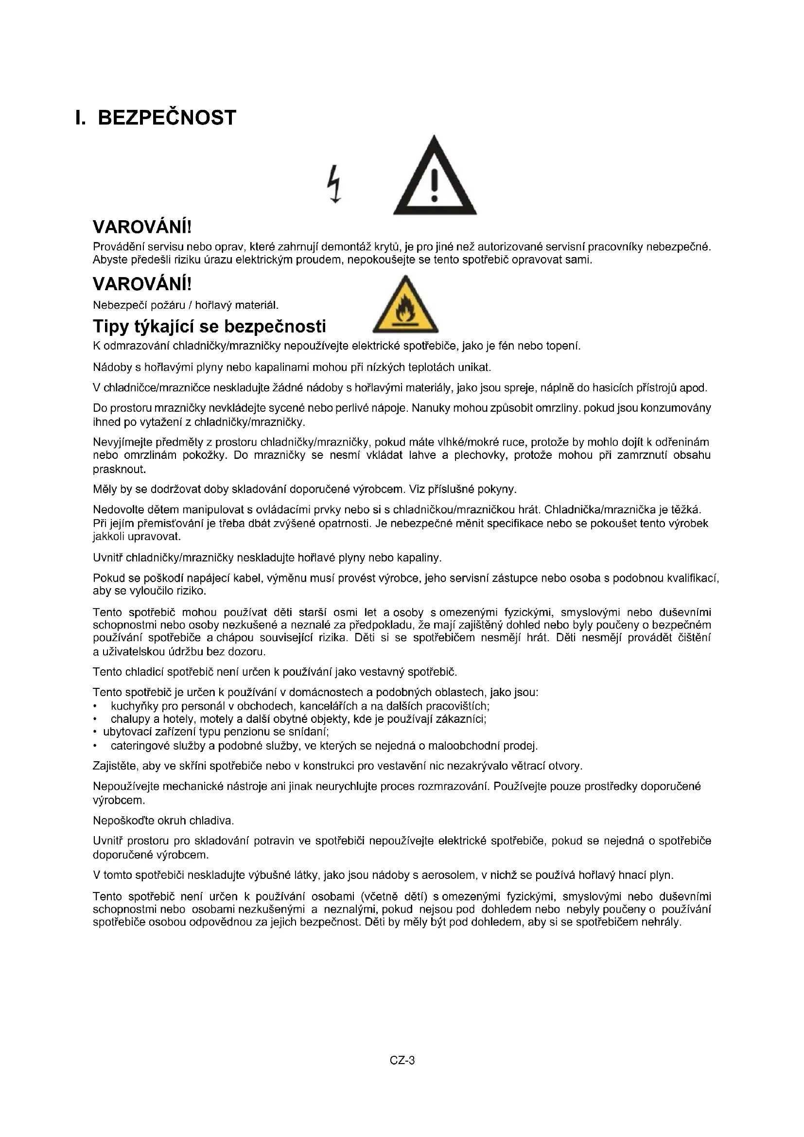 - cateringové služby a podobné služby, ve kterých se nejedná o maloobchodní prodej. Zajistěte, aby ve skříni spotřebiče nebo v konstrukci pro vestavění nic nezakrývalo větrací otvory. Nepoužívejte mechanické nástroje ani jinak neurychlujte proces rozmrazování. Používejte pouze prostředky doporučené výrobcem. Nepoškoďte okruh chladiva. Uvnitř prostoru pro skladování potravin ve spotřebiči nepoužívejte elektrické spotřebiče, pokud se nejedná o spotřebiče doporučené výrobcem. V tomto spotřebiči neskladujte výbušné látky, jako jsou nádoby s aerosolem, v nichž se používá hořlavý hnací plyn. Tento spotřebič není určen k používání osobami (včetně dětí) s omezenými fyzickými, smyslovými nebo duševními schopnostmi nebo osobami nezkušenými a neznalými, pokud nejsou pod dohledem nebo nebyly poučeny o používání spotřebiče osobou odpovědnou za jejich bezpečnost. Děti by měly být pod dohledem, aby si se spotřebičem nehrály.CZ-4 - VAROVÁNÍ: Zajistěte, aby ve skříni spotřebiče nebo v konstrukci pro vestavění nic nezakrývalo větrací otvory. - VAROVÁNÍ: Nepoužívejte mechanické nástroje ani jinak neurychlujte proces rozmrazování. Používejte pouze prostředky doporučené výrobcem. - VAROVÁNÍ: Nepoškoďte okruh chladiva. - VAROVÁNÍ: Uvnitř prostoru pro skladování potravin ve spotřebiči nepoužívejte elektrické spotřebiče, pokud se nejedná o spotřebiče doporučené výrobcem. - VAROVÁNÍ: Jestliže se chladicí spotřebiče (zejména chladnička s mrazničkou typu I) používají delší dobu pod spodní hranicí rozsahu teplot, pro které jsou určeny, jejich provoz nemusí být konzistentní (může docházet k rozmrazování obsahu nebo příliš velkému nárůstu teploty v prostoru pro mražené potraviny); - VAROVÁNÍ: Jestliže jsou dvířka nebo víka opatřena zámky, je nutné uchovávat klíče mimo dosah dětí a nikoli v blízkosti chladicího spotřebiče, aby se zamezilo uzamknutí dětí uvnitř spotřebiče. - VAROVÁNÍ: Chladivo a izolační materiály použité ve spotřebiči vyžadují speciální postupy likvidace. - VAROVÁNÍ: Při umisťování spotřebiče se ujistěte, že napájecí kabel není zachycený nebo poškozený. - VAROVÁNÍ: Neumisťujte za spotřebič přenosné rozbočovací zásuvky ani prodlužovací kabely. Děti ve věku od tří do osmi let smějí vkládat potraviny a vyjímat je z chladicích spotřebičů. Dodržujte následující pokyny, aby nedošlo ke kontaminaci potravin: – Otevírání dvířek na delší dobu může významně zvýšit teplotu v jednotlivých prostorech spotřebiče. – Pravidelně čistěte povrchy, které mohou přijít do styku s potravinami, a přístupné vypouštěcí systémy. – Pokud se nádrže na vodu nepoužívaly po dobu 48 h, vyčistěte je. Pokud nebyla vypuštěna voda po dobu 5 dnů, propláchněte vodní systém připojený k přívodu vody. – Syrové maso a ryby skladujte uvnitř mrazáku ve vhodných nádobách, aby se nedostaly do styku s jinými potravinami, nebo z nich neodkapávala šťáva na jiné potraviny. – Prostory pro zmrazené potraviny označené dvěma hvězdičkami jsou vhodné k ukládání mražených potravin, ukládání nebo výrobě zmrzliny a výrobě ledových kostek. – Prostory označené jednou, dvěma a třemi hvězdičkami nejsou vhodné k zmrazování čerstvých potravin. – Pokud je chladicí spotřebič ponechán delší dobu prázdný, vypněte ho, odmrazte, vyčistěte, vysušte a nechte otevřená dvířka, aby se zamezilo vzniku plísně uvnitř spotřebiče. Elektrické zapojení VAROVÁNÍ Napájecí kabel tohoto spotřebiče je vybaven zástrčkou, která se zasunuje do standardních zásuvek, aby se minimalizovala možnost úrazu elektrickým proudem. Za všech okolností se ujistěte, že je napájecí kabel uzemněn. Tento chladicí spotřebič vyžaduje standardní elektrickou zásuvku 220-240 V AC 50 Hz s uzemněním. Tento chladicí spotřebič není určen k použití se střídačem. Kabel by měl být upevněn za spotřebičem a neměl by se nechat odkrytý nebo volně visící, aby se předešlo náhodnému úrazu. Chladničku nikdy neodpojujte vytažením napájecího kabelu. Vždy pevně uchopte zástrčku a vytáhněte ji rovně ze zásuvky. S tímto spotřebičem nepoužívejte prodlužovací kabel. Pokud je napájecí kabel příliš krátký, nechte kvalifikovaného elektrikáře nebo servisního technika nainstalovat zásuvku v blízkosti spotřebiče. Použití prodlužovacího kabelu může negativně ovlivnit výkon spotřebiče. Nesprávné použití uzemněné zástrčky může vést k riziku úrazu elektrickým proudem. Pokud je napájecí kabel poškozený, nechte ho vyměnit autorizovaným servisním střediskem. Klimatický rozsah Informace o klimatickém rozsahu spotřebiče jsou uvedeny na výrobním štítku. Uvádí, při jaké teplotě okolí (tj. teplotě místnosti, ve které spotřebič pracuje) je provoz spotřebiče optimální (správný). Klimatický rozsah Přípustná okolní teplota